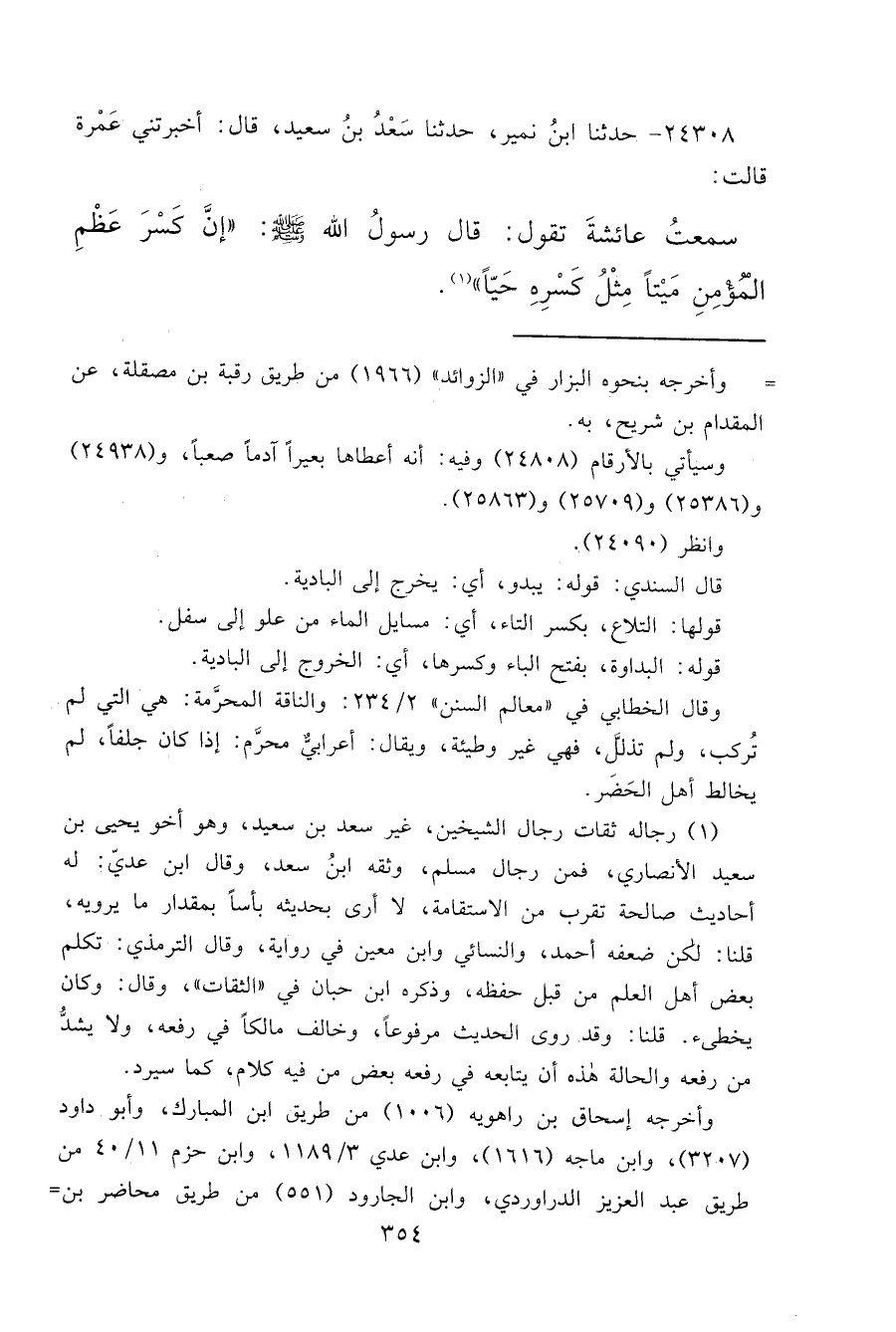 ٢٤٣٠٨ - حَدَّثَنَا ابْنُ نُمَيْرٍ، حَدَّثَنَا سَعْدُ بْنُ سَعِيدٍ قَالَ: أَخْبَرَتْنِي عَمْرَةُ قَالَتْ: سَمِعْتُ عَائِشَةَ تَقُولُ: قَالَ رَسُولُ اللهِ صَلَّى اللهُ عَلَيْهِ وَسَلَّمَ: " إِنَّ كَسْرَ عَظْمِ الْمُؤْمِنِ مَيْتًا، مِثْلُ كَسْرِهِ حَيًّا " (١)
