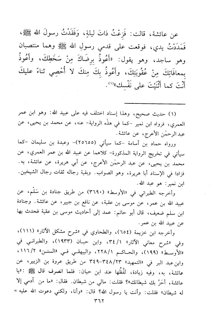 عَنْ عَائِشَةَ قَالَتْ: فَزِعْتُ ذَاتَ لَيْلَةٍ، وَفَقَدْتُ رَسُولَ اللهِ صَلَّى اللهُ عَلَيْهِ وَسَلَّمَ، فَمَدَدْتُ يَدِي، فَوَقَعَتْ عَلَى قَدَمَيْ رَسُولِ اللهِ صَلَّى اللهُ عَلَيْهِ وَسَلَّمَ وَهُمَا مُنْتَصِبَانِ وَهُوَ سَاجِدٌ، وَهُوَ يَقُولُ: " أَعُوذُ بِرِضَاكَ مِنْ سَخَطِكَ، وَأَعُوذُ بِمُعَافَاتِكَ مِنْ عُقُوبَتِكَ، وَأَعُوذُ بِكَ مِنْكَ، لَا أُحْصِي ثَنَاءً عَلَيْكَ أَنْتَ كَمَا أَثْنَيْتَ عَلَى نَفْسِكَ " (١)