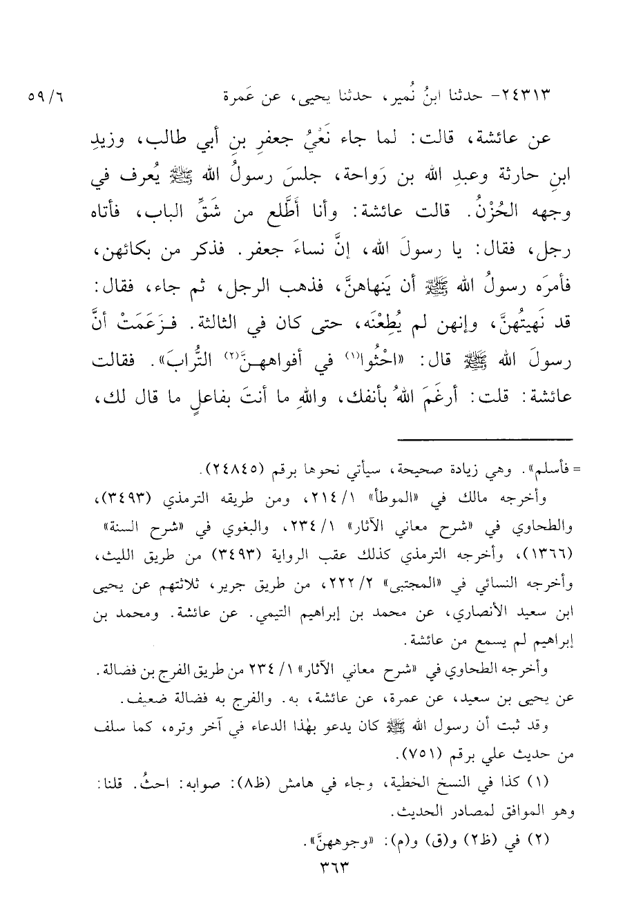 ٢٤٣١٣ - حَدَّثَنَا ابْنُ نُمَيْرٍ، حَدَّثَنَا يَحْيَى، عَنْ عَمْرَةَ، عَنْ عَائِشَةَ قَالَتْ: لَمَّا جَاءَ نَعْيُ جَعْفَرِ بْنِ أَبِي طَالِبٍ وَزَيْدِ بْنِ حَارِثَةَ وَعَبْدِ اللهِ بْنِ رَوَاحَةَ جَلَسَ رَسُولُ اللهِ صَلَّى اللهُ عَلَيْهِ وَسَلَّمَ يُعْرَفُ فِي وَجْهِهِ الْحُزْنُ، قَالَتْ عَائِشَةُ: وَأَنَا أَطَّلِعُ مِنْ شَقِّ الْبَابِ، فَأَتَاهُ رَجُلٌ فَقَالَ: يَا رَسُولَ اللهِ، إِنَّ نِسَاءَ جَعْفَرٍ، فَذَكَرَ مِنْ بُكَائِهِنَّ، فَأَمَرَهُ رَسُولُ اللهِ صَلَّى اللهُ عَلَيْهِ وَسَلَّمَ أَنْ يَنْهَاهُنَّ، فَذَهَبَ الرَّجُلُ، ثُمَّ جَاءَ، فَقَالَ: قَدْ نَهَيْتُهُنَّ، وَإِنَّهُنَّ لَمْ يُطِعْنَهُ حَتَّى كَانَ فِي الثَّالِثَةِ، فَزَعَمْتُ أَنَّ رَسُولَ اللهِ صَلَّى اللهُ عَلَيْهِ وَسَلَّمَ قَالَ: " احْثُوا (١) فِي أَفْوَاهِهِنَّ (٢) التُّرَابَ " فَقَالَتْ عَائِشَةُ: قُلْتُ: أَرْغَمَ اللهُ بِأَنْفِكَ، وَاللهِ مَا أَنْتَ بِفَاعِلٍ مَا قَالَ لَكَ،