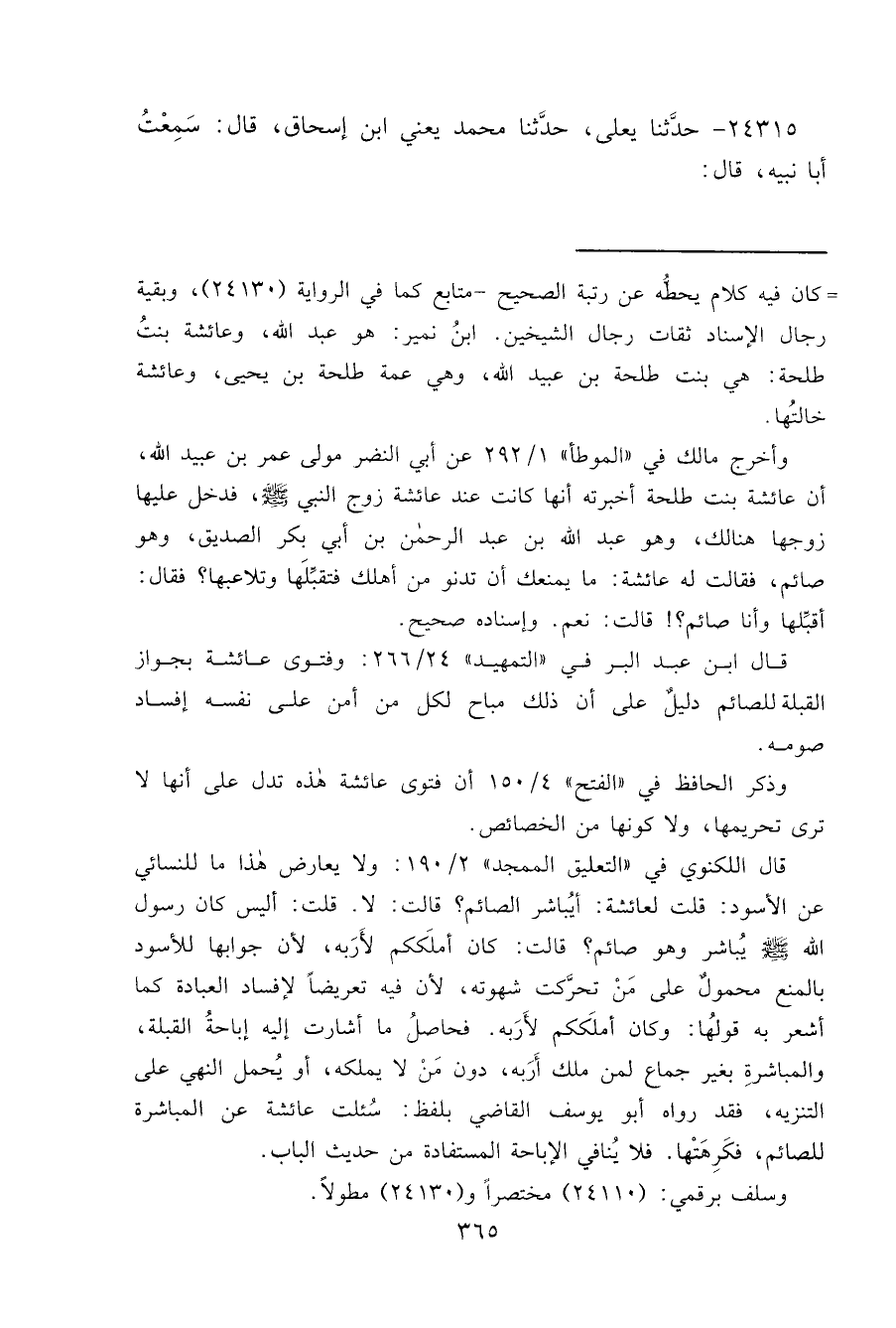 = كان فيه كلام يحطُّه عن رتبة الصحيح- متابع كما في الرواية (٢٤١٣٠) ، وبقية رجال الإسناد ثقات رجال الشيخين. ابنُ نمير: هو عبد الله، وعائشة بنتُ طلحة: هي بنت طلحة بن عبيد الله، وهي عمة طلحة بن يحيى، وعائشة خالتُها.