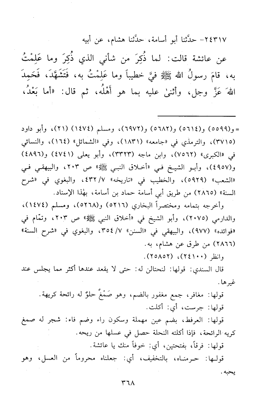 ٢٤٣١٧ - حَدَّثَنَا أَبُو أُسَامَةَ، حَدَّثَنَا هِشَامٌ، عَنْ أَبِيهِ، عَنْ عَائِشَةَ قَالَتْ: لَمَّا ذُكِرَ مِنْ شَأْنِي الَّذِي ذُكِرَ، وَمَا عَلِمْتُ بِهِ، قَامَ رَسُولُ اللهِ صَلَّى اللهُ عَلَيْهِ وَسَلَّمَ فِيَّ خَطِيبًا، وَمَا عَلِمْتُ بِهِ، فَتَشَهَّدَ، فَحَمِدَ اللهَ عَزَّ وَجَلَّ وَأَثْنَى عَلَيْهِ بِمَا هُوَ أَهْلُهُ، ثُمَّ قَالَ: " أَمَّا بَعْدُ،