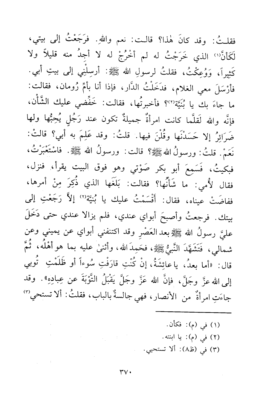 فَقُلْتُ: وَقَدْ كَانَ هَذَا؟ قَالَتْ: نَعَمْ وَاللهِ، فَرَجَعْتُ إِلَى بَيْتِي، لَكَأَنَّ (١) الَّذِي خَرَجْتُ لَهُ لَمْ أَخْرُجْ لَهُ، لَا أَجِدُ مِنْهُ قَلِيلًا، وَلَا كَثِيرًا، وَوَعَكْتُ، فَقُلْتُ لِرَسُولِ اللهِ صَلَّى اللهُ عَلَيْهِ وَسَلَّمَ: أَرْسِلْنِي إِلَى بَيْتِ أَبِي، فَأَرْسَلَ مَعِي الْغُلَامَ، فَدَخَلْتُ الدَّارَ، فَإِذَا أَنَا بِأُمِّ رُومَانَ فَقَالَتْ: مَا جَاءَ بِكِ يَا بُنَيَّةُ؟ فَأَخْبَرْتُهَا، فَقَالَتْ: خَفِّضِي عَلَيْكِ الشَّأْنَ، فَإِنَّهُ وَاللهِ لَقَلَّمَا كَانَتْ امْرَأَةٌ جَمِيلَةٌ تَكُونُ عِنْدَ رَجُلٍ يُحِبُّهَا وَلَهَا ضَرَائِرُ إِلَّا حَسَدْنَهَا وَقُلْنَ: فِيهَا قُلْتُ، وَقَدْ عَلِمَ بِهِ أَبِي؟ قَالَتْ: نَعَمْ، قُلْتُ: وَرَسُولُ اللهِ صَلَّى اللهُ عَلَيْهِ وَسَلَّمَ؟ قَالَتْ: وَرَسُولُ اللهِ صَلَّى اللهُ عَلَيْهِ وَسَلَّمَ، فَاسْتَعْبَرْتُ، فَبَكَيْتُ، فَسَمِعَ أَبُو بَكْرٍ صَوْتِي وَهُوَ فَوْقَ الْبَيْتِ يَقْرَأُ، فَنَزَلَ، فَقَالَ لِأُمِّي: مَا شَأْنُهَا؟ قَالَتْ: بَلَغَهَا الَّذِي ذُكِرَ مِنْ أَمْرِهَا، فَفَاضَتْ عَيْنَاهُ، فَقَالَ: أَقْسَمْتُ عَلَيْكِ يَا بُنَيَّةُ (٢) ، إِلَّا رَجَعْتِ إِلَى بَيْتِكِ، فَرَجَعْتُ، وَأَصْبَحَ أَبَوَايَ عِنْدِي، فَلَمْ يَزَالَا عِنْدِي، حَتَّى دَخَلَ عَلَيَّ رَسُولُ اللهِ صَلَّى اللهُ عَلَيْهِ وَسَلَّمَ بَعْدَ الْعَصْرِ، وَقَدِ اكْتَنَفَنِي أَبَوَايَ عَنْ يَمِينِي، وَعَنْ شِمَالِي، فَتَشَهَّدَ النَّبِيُّ صَلَّى اللهُ عَلَيْهِ وَسَلَّمَ، فَحَمِدَ اللهَ وَأَثْنَى عَلَيْهِ بِمَا هُوَ أَهْلُهُ، ثُمَّ قَالَ: " أَمَّا بَعْدُ يَا عَائِشَةُ، إِنْ كُنْتِ قَارَفْتِ سُوءً أَوْ ظَلَمْتِ، تُوبِي إِلَى اللهِ عَزَّ وَجَلَّ، فَإِنَّ اللهَ عَزَّ وَجَلَّ يَقْبَلُ التَّوْبَةَ عَنْ عِبَادِهِ " وَقَدْ جَاءَتْ امْرَأَةٌ مِنَ الْأَنْصَارِ فَهِيَ جَالِسَةٌ بِالْبَابِ، فَقُلْتُ: أَلَا تَسْتَحِي (٣)