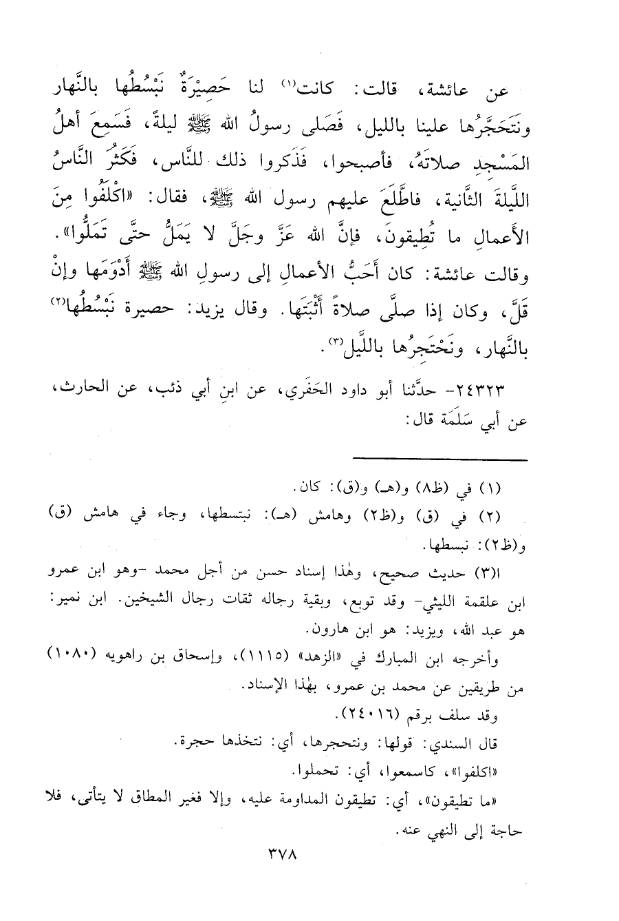 عَنْ عَائِشَةَ قَالَتْ: كَانَتْ (١) لَنَا حَصِيرَةٌ نَبْسُطُهَا بِالنَّهَارِ، وَنَتَحَجَّرُهَا عَلَيْنَا بِاللَّيْلِ، فَصَلَّى رَسُولُ اللهِ صَلَّى اللهُ عَلَيْهِ وَسَلَّمَ لَيْلَةً، فَسَمِعَ أَهْلُ الْمَسْجِدِ صَلَاتَهُ، فَأَصْبَحُوا، فَذَكَرُوا ذَلِكَ لِلنَّاسِ، فَكَثُرَ النَّاسُ اللَّيْلَةَ الثَّانِيَةَ، فَاطَّلَعَ عَلَيْهِمْ رَسُولُ اللهِ صَلَّى اللهُ عَلَيْهِ وَسَلَّمَ فَقَالَ: " اكْلَفُوا مِنَ الْأَعْمَالِ مَا تُطِيقُونَ، فَإِنَّ اللهَ عَزَّ وَجَلَّ لَا يَمَلُّ حَتَّى تَمَلُّوا "
