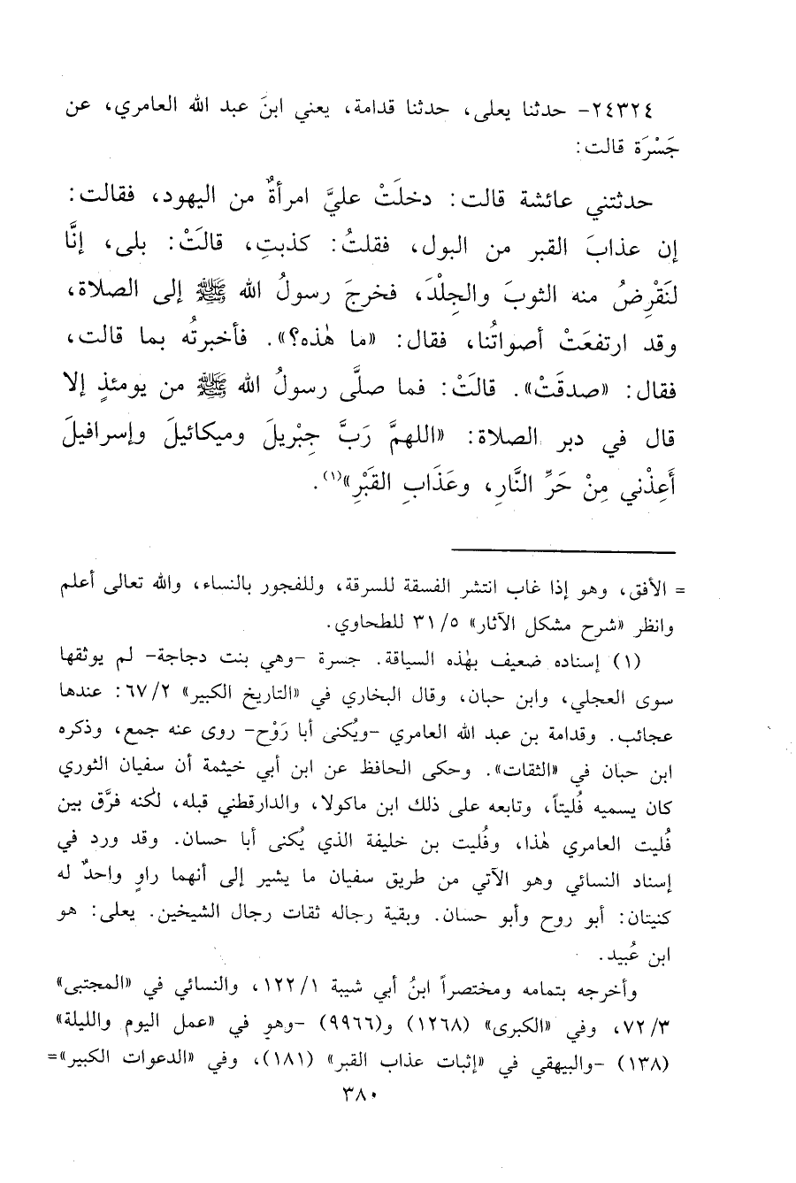 ٢٤٣٢٤ - حَدَّثَنَا يَعْلَى، حَدَّثَنَا قُدَامَةُ يَعْنِي ابْنَ عَبْدِ اللهِ الْعَامِرِيَّ، عَنْ جَسْرَةَ قَالَتْ: حَدَّثَتْنِي عَائِشَةُ قَالَتْ: دَخَلَتْ عَلَيَّ امْرَأَةٌ مِنَ الْيَهُودِ فَقَالَتْ: إِنَّ عَذَابَ الْقَبْرِ مِنَ الْبَوْلِ، فَقُلْتُ: كَذَبْتِ، فَقَالَتْ: بَلَى، إِنَّا لَنَقْرِضُ مِنْهُ الثَّوْبَ وَالْجِلْدَ، فَخَرَجَ رَسُولُ اللهِ صَلَّى اللهُ عَلَيْهِ وَسَلَّمَ إِلَى الصَّلَاةِ، وَقَدْ ارْتَفَعَتْ أَصْوَاتُنَا، فَقَالَ: " مَا هَذِهِ؟ " فَأَخْبَرْتُهُ بِمَا قَالَتْ: فَقَالَ: " صَدَقَتْ "، قَالَتْ: فَمَا صَلَّى رَسُولُ اللهِ صَلَّى اللهُ عَلَيْهِ وَسَلَّمَ مِنْ يَوْمِئِذٍ إِلَّا قَالَ فِي دُبُرِ الصَّلَاةِ: " اللهُمَّ رَبَّ جِبْرِيلَ، وَمِيكَائِيلَ، وَإِسْرَافِيلَ، أَعِذْنِي مِنْ حَرِّ النَّارِ، وَعَذَابِ الْقَبْرِ " (١)