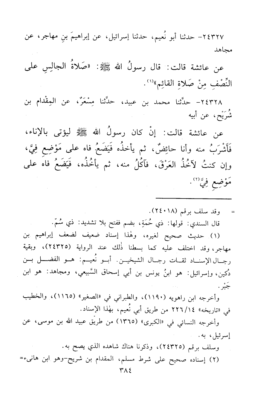 ٢٤٣٢٨ - حَدَّثَنَا مُحَمَّدُ بْنُ عُبَيْدٍ، حَدَّثَنَا مِسْعَرٌ، عَنِ الْمِقْدَامِ بْنِ شُرَيْحٍ، عَنْ أَبِيهِ، عَنْ عَائِشَةَ قَالَتْ: " إِنْ كَانَ رَسُولُ اللهِ صَلَّى اللهُ عَلَيْهِ وَسَلَّمَ لَيُؤْتَى بِالْإِنَاءِ فَأَشْرَبُ مِنْهُ، وَأَنَا حَائِضٌ، ثُمَّ يَأْخُذُهُ فَيَضَعُ فَاهُ عَلَى مَوْضِعِ فِيَّ، وَإِنْ كُنْتُ لَآخُذُ الْعَرْقَ فَآكُلُ مِنْهُ، ثُمَّ يَأْخُذُهُ فَيَضَعُ فَاهُ عَلَى مَوْضِعِ فِيَّ " (٢)