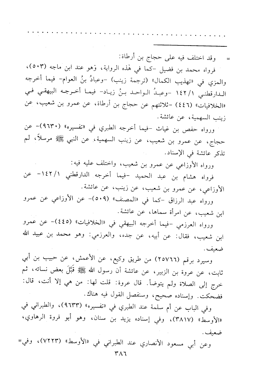 فرواه محمد بن فضيات- كما في هذه الرواية، وهو عند ابن ماجه (٥٠٣) ، والمزي في "تهذيب الكمال" (ترجمة زينب) - وعبادُ بنُ العوام- فيما أخرجه الدارقطني ١/١٤٢- وعبدُ الواحد بنُ زياد- فيما أخرجه البيهقي في "الخلافيات" (٤٤٦) - ثلاثتهم عن حجاج بن أرطأة، عن عمرو بن شعيب، عن زينب السهمية، عن عائشة.