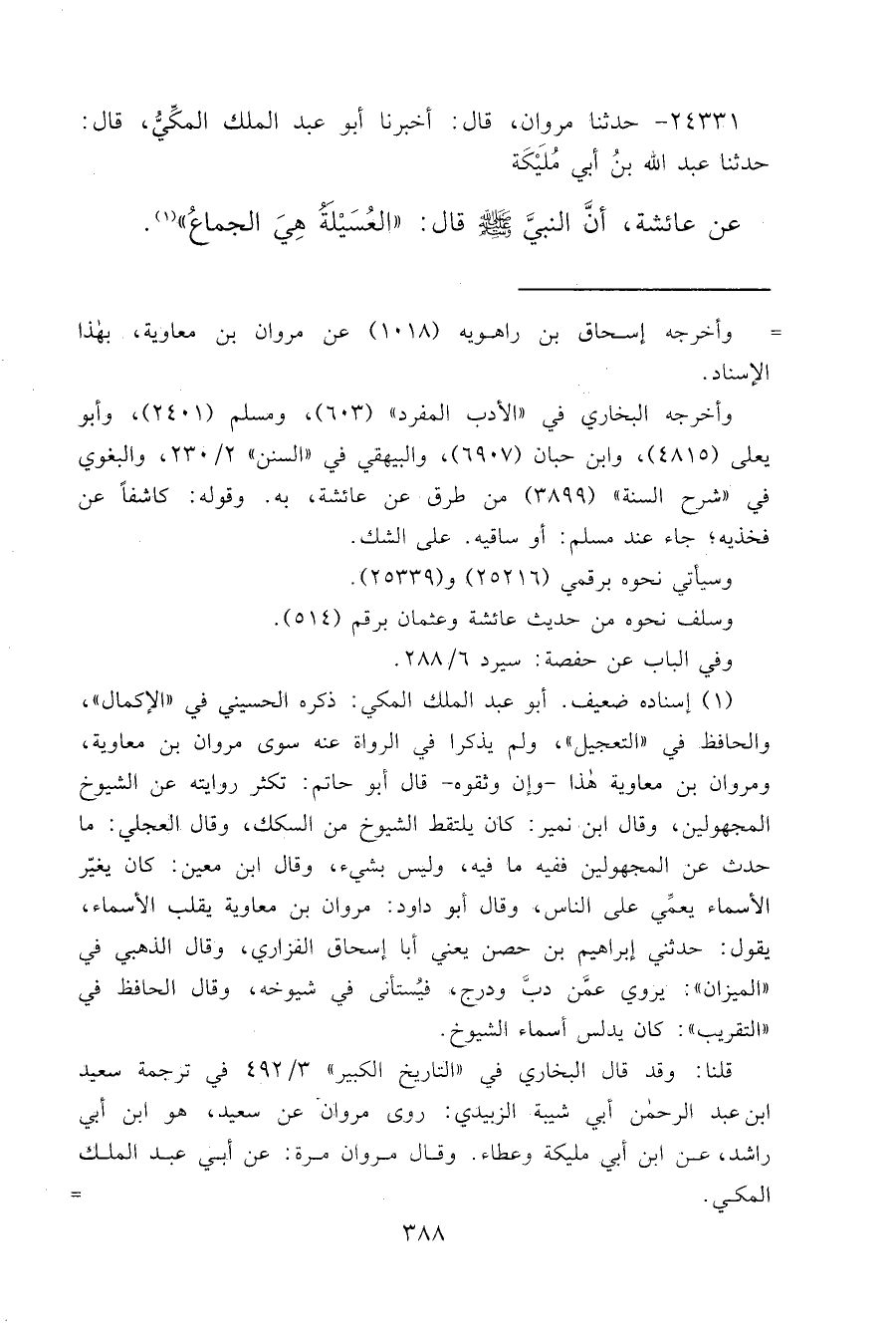 ٢٤٣٣١ - حَدَّثَنَا مَرْوَانُ قَالَ: أَخْبَرَنَا أَبُو عَبْدِ الْمَلِكِ الْمَكِّيُّ قَالَ: حَدَّثَنَا عَبْدُ اللهِ بْنُ أَبِي مُلَيْكَةَ، عَنْ عَائِشَةَ، أَنَّ النَّبِيَّ صَلَّى اللهُ عَلَيْهِ وَسَلَّمَ قَالَ: " الْعُسَيْلَةُ هِيَ الْجِمَاعُ " (١)