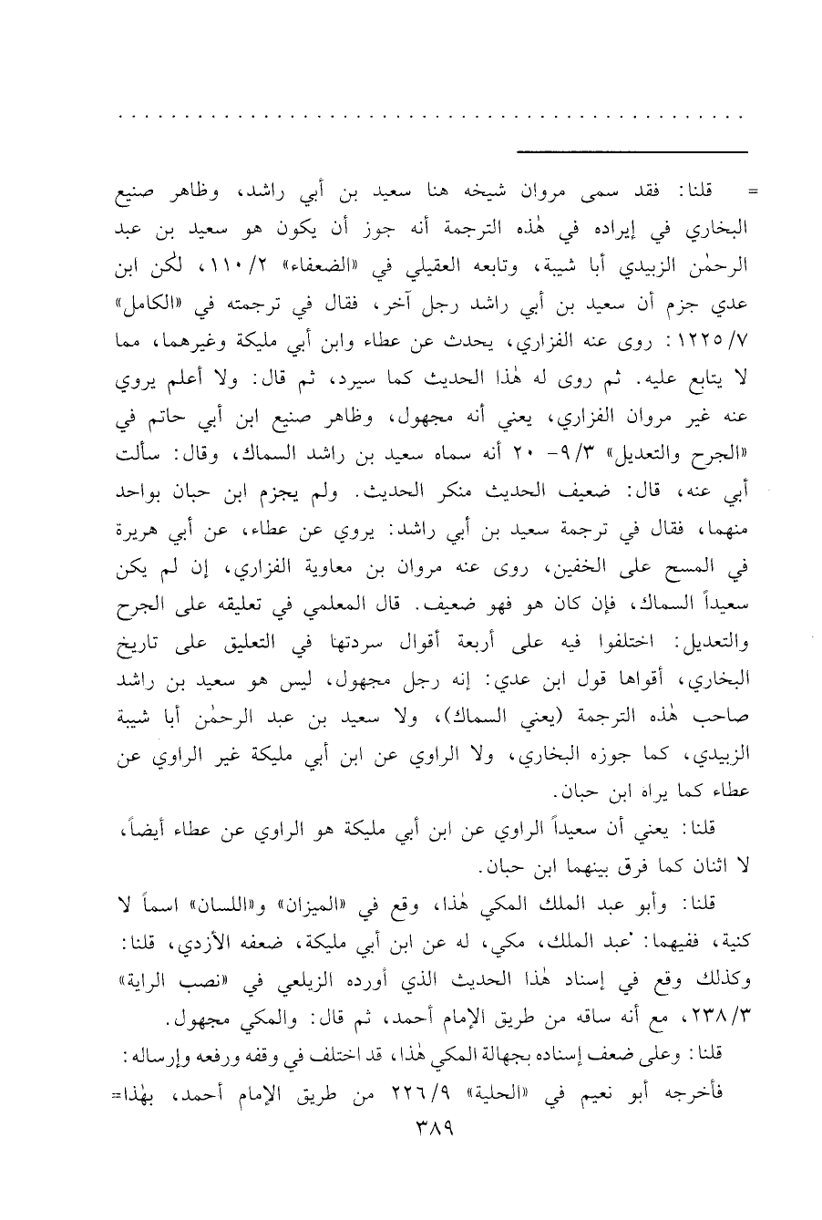 منهما، فقالوا في ترجمة سعيد بن أبي راشد: يروي عن عطاء، عن أبي هريرة في المسح على الخفين، روى عنه مروان بن معاوية الفزاري، إن لم يكن سعيداً السماك، فإن كان هو فهو ضعيف. قال المعلمي في تعليقه على الجرح والتعديل: اختلفوا فيه على أربعة أقوال سردتها في التعليق على تاريخ البخاري، أقواها قولها ابن عدي: إنه رجل مجهول، ليس هو سعيد بن راشد صاحب هذه الترجمة (يعني السماك) ، ولا سعيد بن عبد الرحمن أبا شيبة الزبيدي، كما جوزه البخاري، ولا الراوي عن ابن أبي مليكة غير الراوي عن عطاء كما يراه ابن حبان.