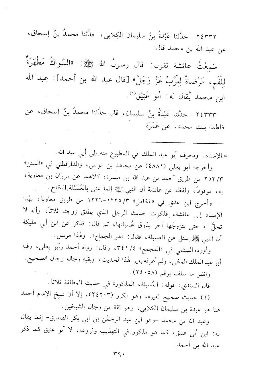 ٢٤٣٣٢ - حَدَّثَنَا عَبْدَةُ بْنُ سُلَيْمَانَ الْكِلَابِيُّ، حَدَّثَنَا مُحَمَّدُ بْنُ إِسْحَاقَ، عَنْ عَبْدِ اللهِ بْنِ مُحَمَّدٍ قَالَ: سَمِعْتُ عَائِشَةَ تَقُولُ: قَالَ رَسُولُ اللهِ صَلَّى اللهُ عَلَيْهِ وَسَلَّمَ: " السِّوَاكُ مَطْهَرَةٌ لِلْفَمِ، مَرْضَاةٌ لِلرَّبِّ عَزَّ وَجَلَّ " قَالَ عَبْدُ اللهِ بْنُ أَحْمَدَ " عَبْدُ اللهِ بْنُ مُحَمَّدٍ: يُقَالُ لَهُ: أَبُو عَتِيقٍ " (١)