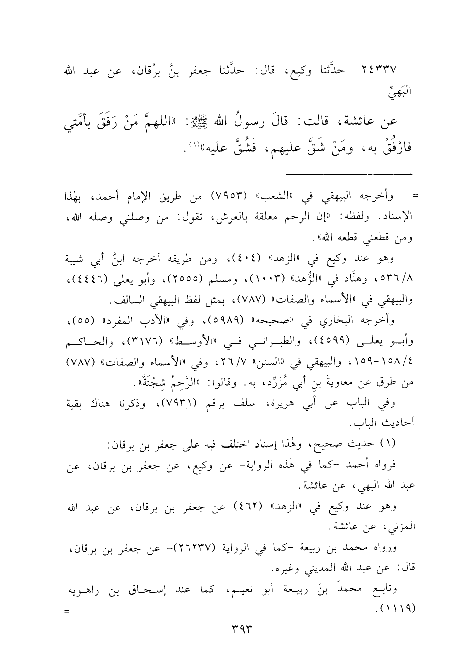 ٢٤٣٣٧ - حَدَّثَنَا وَكِيعٌ قَالَ: حَدَّثَنَا جَعْفَرُ بْنُ بُرْقَانَ، عَنْ عَبْدِ اللهِ الْبَهِيِّ، عَنْ عَائِشَةَ قَالَتْ: قَالَ رَسُولُ اللهِ صَلَّى اللهُ عَلَيْهِ وَسَلَّمَ: " اللهُمَّ مَنْ رَفَقَ بِأُمَّتِي فَارْفُقْ بِهِ، وَمَنْ شَقَّ عَلَيْهِمْ فَشُقَّ عَلَيْهِ " (١)