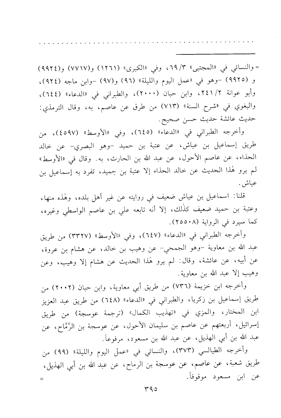 = والنسائي في "المجتبى" ٣/٦٩، وفي "الكبرى" (١٢٦١) و (٧٧١٧) و (٩٩٢٤) و (٩٩٢٥) - وهو في "عمل اليوم والليلة" (٩٦) و (٩٧) - وابن ماجه (٩٢٤) ، وأبو عوانة ٢/٢٤١، وأبن حبان (٢٠٠٠) ، والطبراني في "الدعاء" (٦٤٤) ، والبغوي في "شرح السنة" (٧١٣) من طرق عن عاصم، به، وقال الترمذي: حديث عائشة حديث حسن صحيح.