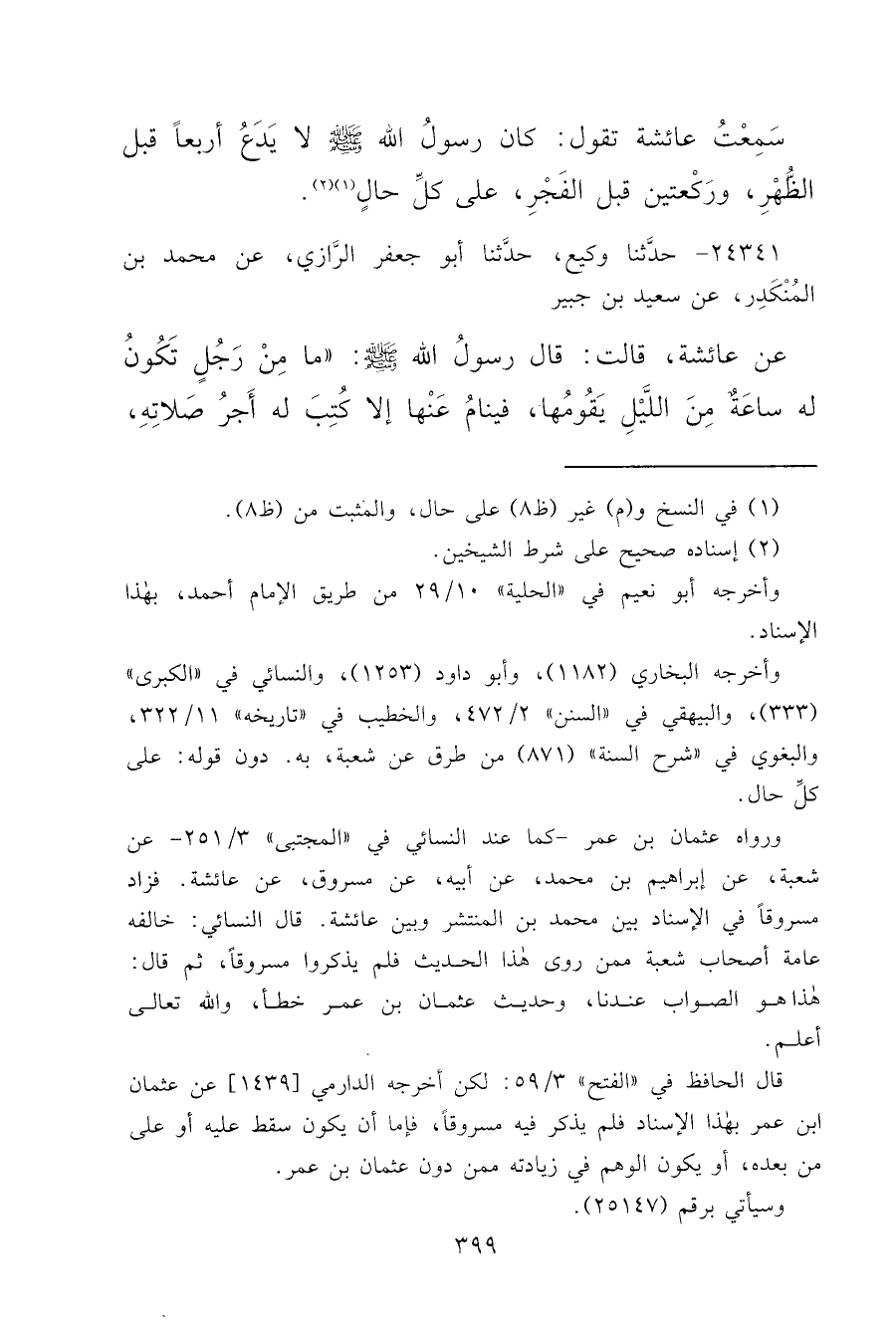 سَمِعْتُ عَائِشَةَ تَقُولُ: " كَانَ رَسُولُ اللهِ صَلَّى اللهُ عَلَيْهِ وَسَلَّمَ لَا يَدَعُ أَرْبَعًا قَبْلَ الظُّهْرِ، وَرَكْعَتَيْنِ قَبْلَ الْفَجْرِ عَلَى كَلِّ حَالٍ (١) " (٢)
