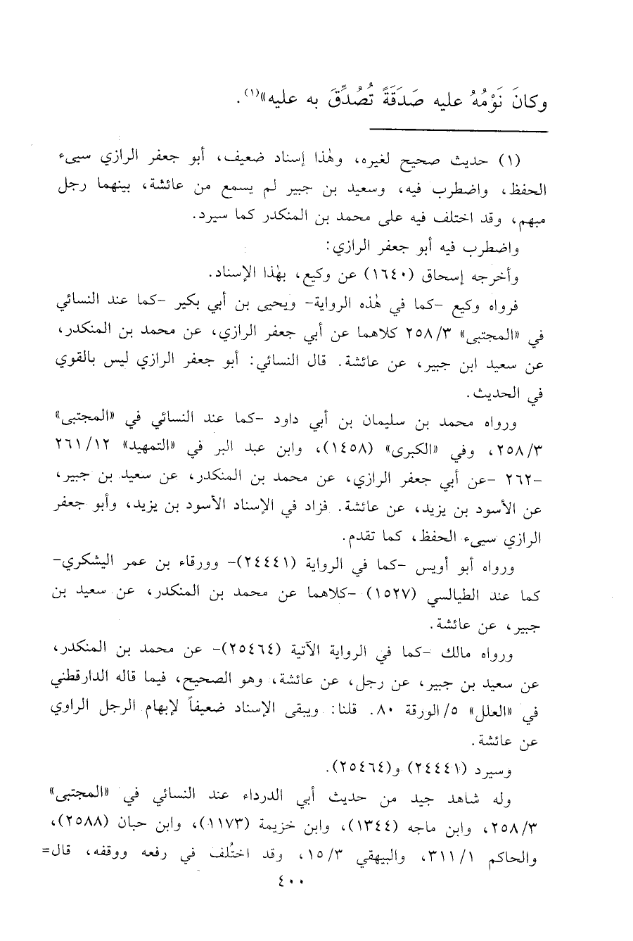 (١) حديث صحيح لغيره، وهذا إسناد ضعيف، أبو جعفر الرازي سيىء الحفظ، واضطرب فيه، وسعيد بن جبير لم يسمع من عائشة، بينهما رجل مبهم، وقد اختلف فيه على محمد بن المنكدر كما سيرد.