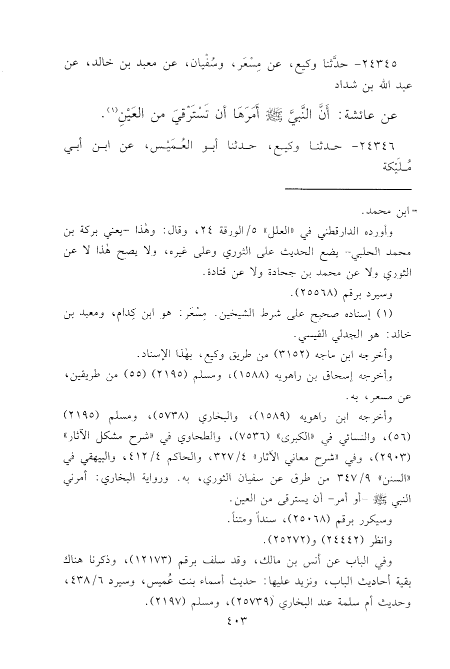 ٢٤٣٤٥ - حَدَّثَنَا وَكِيعٌ، عَنْ مِسْعَرٍ، وَسُفْيَانَ، عَنْ مَعْبَدِ بْنِ خَالِدٍ، عَنْ عَبْدِ اللهِ بْنِ شَدَّادٍ، عَنْ عَائِشَةَ، " أَنَّ النَّبِيَّ صَلَّى اللهُ عَلَيْهِ وَسَلَّمَ أَمَرَهَا أَنْ تَسْتَرْقِيَ مِنَ الْعَيْنِ " (١)