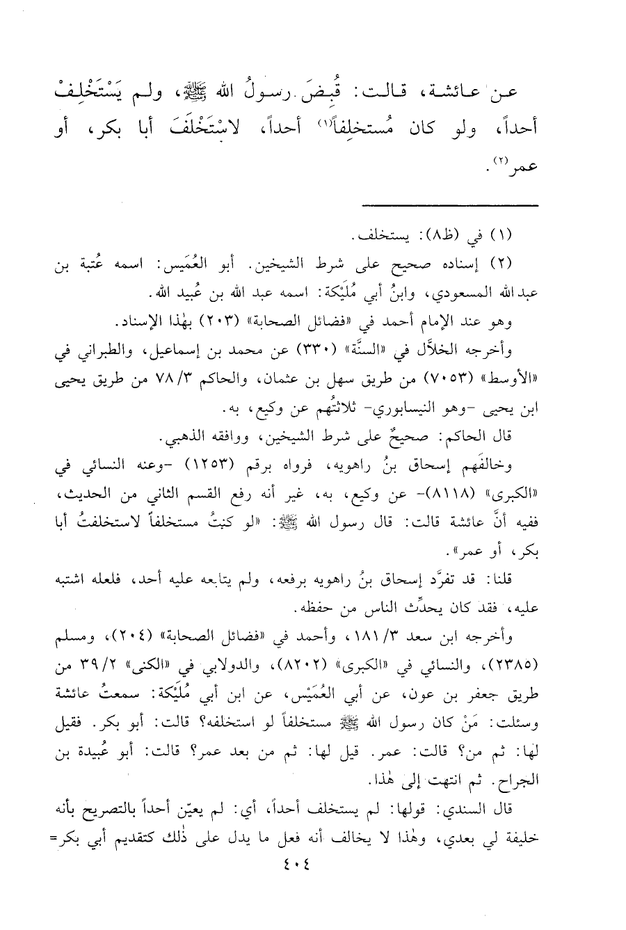 عَنْ عَائِشَةَ قَالَتْ: " قُبِضَ رَسُولُ اللهِ صَلَّى اللهُ عَلَيْهِ وَسَلَّمَ وَلَمْ يَسْتَخْلِفْ أَحَدًا، وَلَوْ كَانَ مُسْتَخْلِفًا (١) أَحَدًا لَاسْتَخْلَفَ أَبَا بَكْرٍ أَوْ عُمَرَ " (٢)