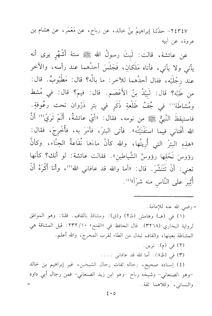 ٢٤٣٤٧ - حَدَّثَنَا إِبْرَاهِيمُ بْنُ خَالِدٍ، عَنْ رَبَاحٍ، عَنْ مَعْمَرٍ، عَنْ هِشَامِ بْنِ عُرْوَةَ، عَنْ أَبِيهِ، عَنْ عَائِشَةَ قَالَتْ: لَبِثَ رَسُولُ اللهِ صَلَّى اللهُ عَلَيْهِ وَسَلَّمَ سِتَّةَ أَشْهُرٍ يَرَى أَنَّهُ يَأْتِي وَلَا يَأْتِي، فَأَتَاهُ مَلَكَانِ، فَجَلَسَ أَحَدُهُمَا عِنْدَ رَأْسِهِ، وَالْآخَرُ عِنْدَ رِجْلَيْهِ، فَقَالَ أَحَدُهُمَا لِلْآخَرِ: مَا بَالُهُ؟ قَالَ: مَطْبُوبٌ قَالَ: مَنْ طَبَّهُ؟ قَالَ: لَبِيدُ بْنُ الْأَعْصَمِ، قَالَ: فِيمَ؟ قَالَ: فِي مُشْطٍ وَمُشَاطَةٍ (١) فِي جُفِّ طَلْعَةِ، ذَكَرٍ فِي بِئْرِ ذَرْوَانَ تَحْتَ رَعُوفَةٍ، فَاسْتَيْقَظَ النَّبِيُّ صَلَّى اللهُ عَلَيْهِ وَسَلَّمَ مِنْ نَوْمِهِ فَقَالَ: " أَيْ عَائِشَةُ أَلَمْ تَرَيْ (٢) أَنَّ اللهَ أَفْتَانِي فِيمَ اسْتَفْتَيْتُهُ "، فَأَتَى الْبِئْرَ، فَأَمَرَ بِهِ، فَأُخْرِجَ، فَقَالَ: " هَذِهِ الْبِئْرُ الَّتِي أُرِيتُهَا، وَاللهِ كَأَنَّ مَاءَهَا نُقَاعَةُ الْحِنَّاءِ، وَكَأَنَّ رُءُوسَ نَخْلِهَا رُءُوسُ الشَّيَاطِينِ ". فَقَالَتْ عَائِشَةُ: لَوْ أَنَّكَ كَأَنَّهَا تَعْنِي أَنْ يَنْتَشِرَ، قَالَ: " أَمَا وَاللهِ قَدْ عَافَانِي اللهُ (٣) ، وَأَنَا أَكْرَهُ أَنْ أُثِيرَ عَلَى النَّاسِ مِنْهُ شَرًّا " (٤)