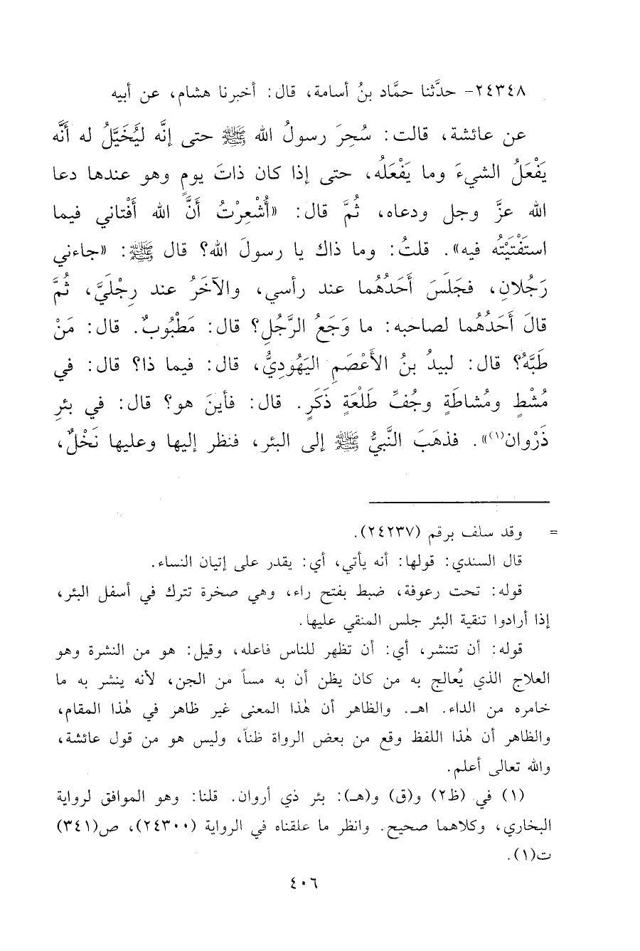 ٢٤٣٤٨ - حَدَّثَنَا حَمَّادُ بْنُ أُسَامَةَ قَالَ: أَخْبَرَنَا هِشَامٌ، عَنْ أَبِيهِ، عَنْ عَائِشَةَ قَالَتْ: سُحِرَ رَسُولُ اللهِ صَلَّى اللهُ عَلَيْهِ وَسَلَّمَ حَتَّى أَنَّهُ لَيُخَيَّلُ لَهُ أَنَّهُ يَفْعَلُ الشَّيْءَ وَمَا يَفْعَلُهُ، حَتَّى إِذَا كَانَ ذَاتَ يَوْمٍ وَهُوَ عِنْدَهَا دَعَا اللهَ عَزَّ وَجَلَّ، وَدَعَاهُ، ثُمَّ قَالَ: " أَشَعَرْتِ أَنَّ اللهَ أَفْتَانِي فِيمَا اسْتَفْتَيْتُهُ فِيهِ " قُلْتُ: وَمَا ذَاكَ يَا رَسُولَ اللهِ؟ قَالَ صَلَّى اللهُ عَلَيْهِ وَسَلَّمَ: " جَاءَنِي رَجُلَانِ فَجَلَسَ أَحَدُهُمَا عِنْدَ رَأْسِي، وَالْآخَرُ عِنْدَ رِجْلَيَّ ثُمَّ قَالَ أَحَدُهُمَا لِصَاحِبِهِ: مَا وَجَعُ الرَّجُلِ؟ قَالَ: مَطْبُوبٌ، قَالَ: مَنْ طَبَّهُ؟ قَالَ: لَبِيدُ بْنُ الْأَعْصَمِ الْيَهُودِيُّ، قَالَ: فِيمَا ذَا؟ قَالَ: فِي مُشْطٍ وَمُشَاطَةٍ، وَجُفِّ طَلْعَةِ ذَكَرٍ، قَالَ: فَأَيْنَ هُوَ؟ قَالَ: فِي بِئْرِ ذَرْوَانَ " (١) ، فَذَهَبَ النَّبِيُّ صَلَّى اللهُ عَلَيْهِ وَسَلَّمَ إِلَى الْبِئْرِ، فَنَظَرَ إِلَيْهَا وَعَلَيْهَا نَخْلٌ،