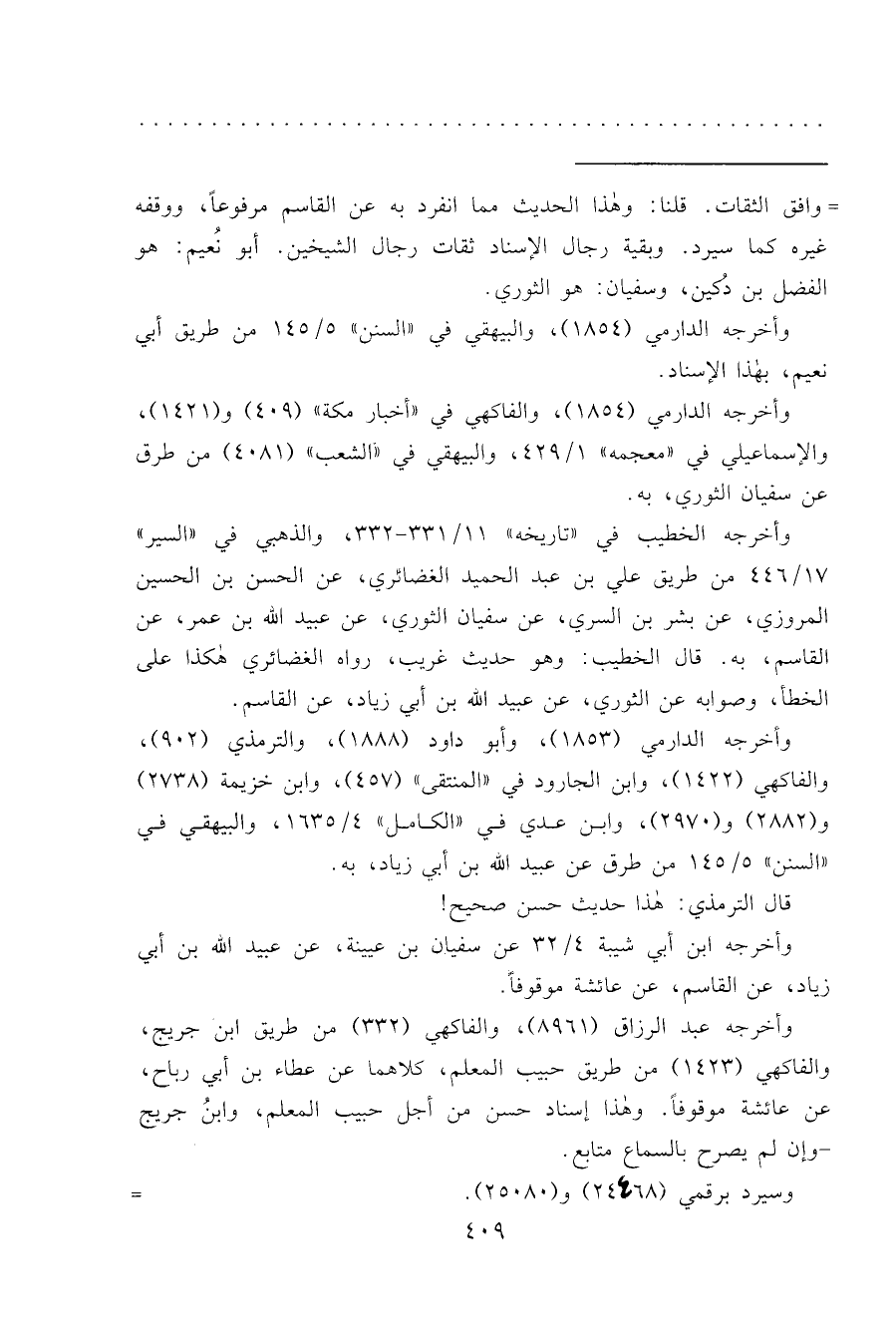 = وافق الثقات. قلنا: وهذا الحديث مما انفرد به عن القاسم مرفوعاً، ووقفه غيره كما سيرد. وبقية رجال الإسناد ثقات رجال الشيخين. أبو نُعيم: هو الفضل بن دكين، وسفيان: هو الثوري.