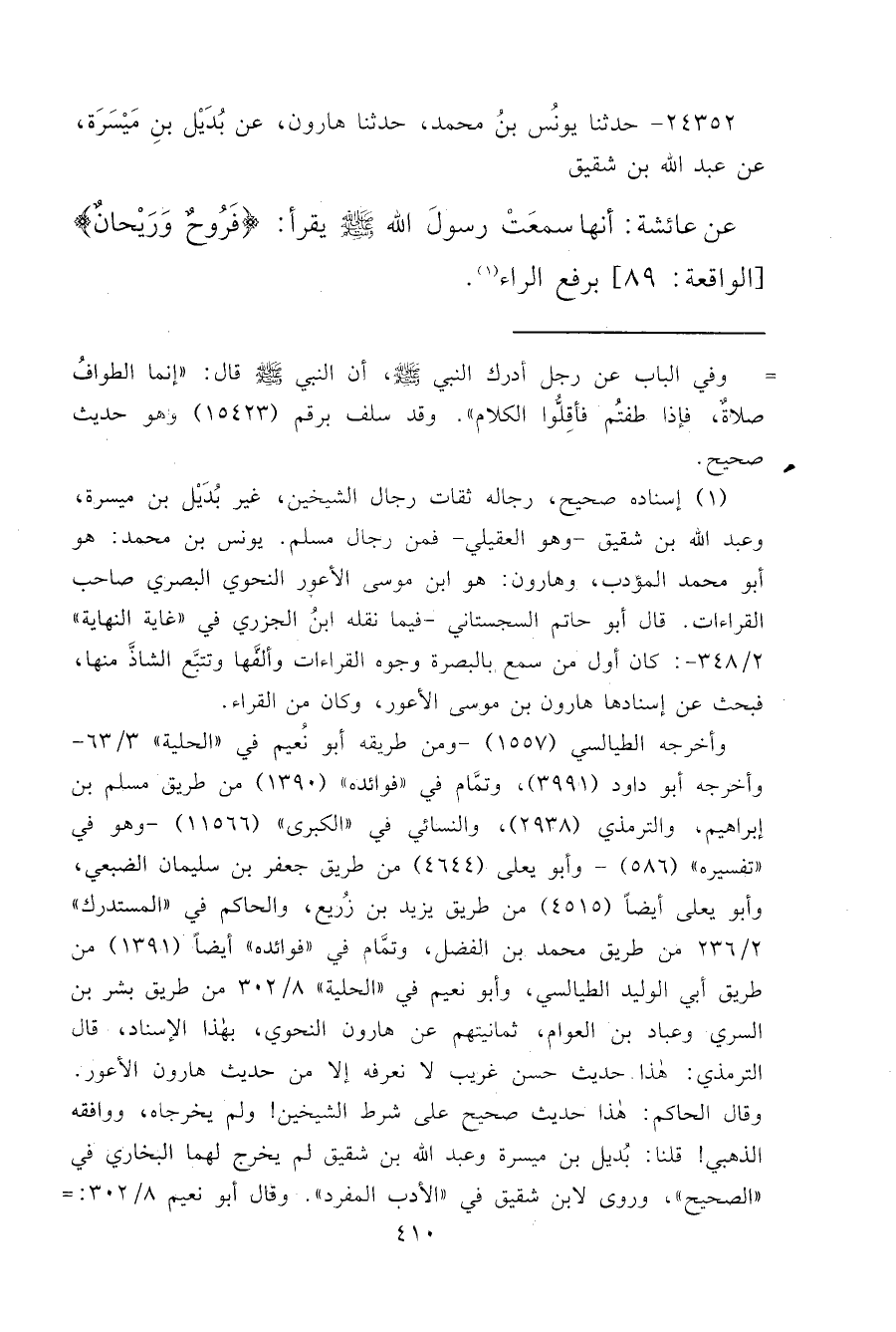 ٢٤٣٥٢ - حَدَّثَنَا يُونُسُ بْنُ مُحَمَّدٍ، حَدَّثَنَا هَارُونُ، عَنْ بُدَيْلِ بْنِ مَيْسَرَةَ، عَنْ عَبْدِ اللهِ بْنِ شَقِيقٍ، عَنْ عَائِشَةَ، " أَنَّهَا سَمِعَتْ رَسُولَ اللهِ صَلَّى اللهُ عَلَيْهِ وَسَلَّمَ يَقْرَأُ {فَرُوحٌ وَرَيْحَانٌ} [الواقعة: ٨٩] بِرَفْعِ الرَّاءِ " (١)