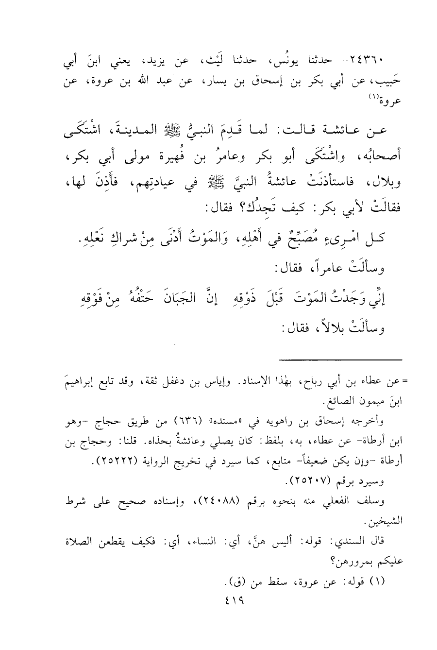 وأخرجه إسحاق بن راهوية في "مسنده" (٦٣٦) من طريق حجاج- وهو ابن أرطاة- عن عطاء، به، بلفظ: كان يصلي وعائشةُ بحذاه. قلنا: وحجاج بن أرطاة- وإن يكن ضعيفاً- متابع، كما سيرد في تخريج الرواية (٢٥٢٢٢) .