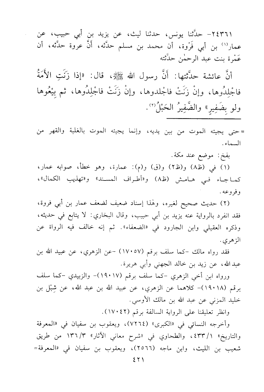 ٢٤٣٦١ - حَدَّثَنَا يُونُسُ، حَدَّثَنَا لَيْثٌ، عَنْ يَزِيدَ بْنِ أَبِي حَبِيبٍ، عَنْ عَمَّارِ (١) بْنِ أَبِي فَرْوَةَ، أَنَّ مُحَمَّدَ بْنَ مُسْلِمٍ حَدَّثَهُ، أَنَّ عُرْوَةَ حَدَّثَهُ، أَنَّ عَمْرَةَ بِنْتَ عَبْدِ الرَّحْمَنِ حَدَّثَتْهُ، أَنَّ عَائِشَةَ حَدَّثَتْهَا، أَنَّ رَسُولَ اللهِ صَلَّى اللهُ عَلَيْهِ وَسَلَّمَ قَالَ: " إِذَا زَنَتِ الْأَمَةُ فَاجْلِدُوهَا، وَإِنْ زَنَتْ فَاجْلِدُوهَا، وَإِنْ زَنَتْ فَاجْلِدُوهَا، ثُمَّ بِيعُوهَا وَلَوْ بِضَفِيرٍ " وَالضَّفِيرُ الْحَبْلُ (٢)