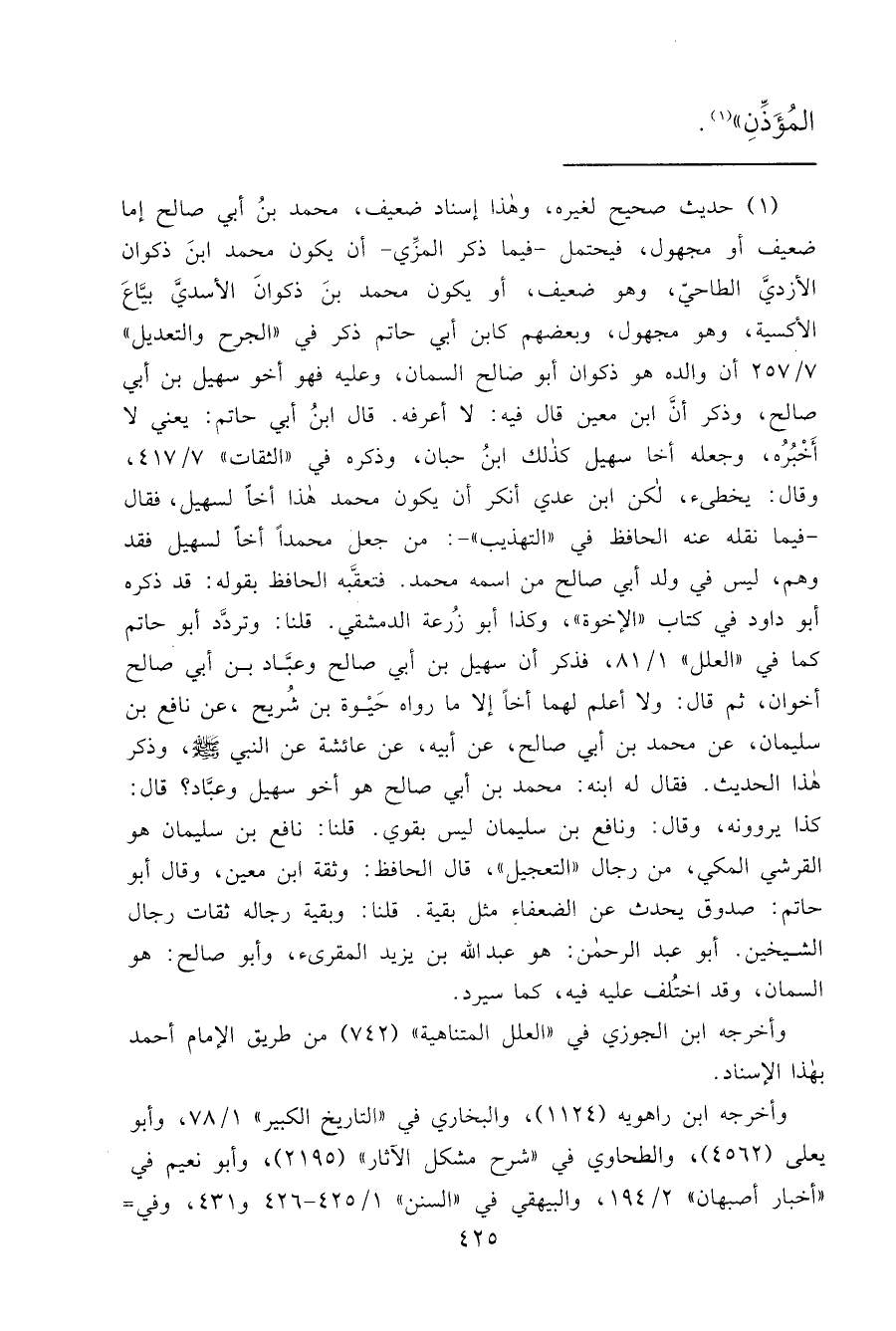 - فيما نقله عنه الحافظ في "التهذيب"-: من جعل محمداً أخاً لسهيل فقد وهم، ليس في ولد أبي صالح من اسمه محمد. فتعقَّبه الحافظ بقوله: قد ذكره أبو داود في كتاب "الإخوة"، وكذا أبو زرعة الدمشقي. قلنا: وتردَّد أبو حاتم كما في "العلل" ١/١٨، فذكر أن سهيل بن أبي صالح وعبَّاد بن أبي صالح