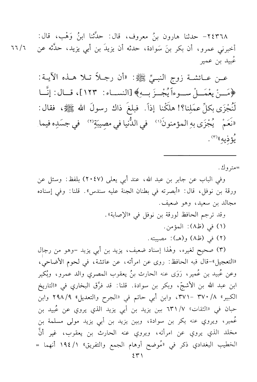 ٢٤٣٦٨ - حَدَّثَنَا هَارُونُ بْنُ مَعْرُوفٍ قَالَ: حَدَّثَنَا ابْنُ وَهْبٍ قَالَ: أَخْبَرَنِي عَمْرٌو، أَنَّ بَكْرَ بْنَ سَوَادَةَ حَدَّثَهُ، أَنَّ يَزِيدَ بْنَ أَبِي يَزِيدَ، حَدَّثَهُ، عَنْ عُبَيْدِ بْنِ عُمَيْرٍ، عَنْ عَائِشَةَ، زَوْجِ النَّبِيِّ صَلَّى اللهُ عَلَيْهِ وَسَلَّمَ، أَنَّ رَجُلًا تَلَا هَذِهِ الْآيَةَ: {مَنْ يَعْمَلْ سُوءًا يُجْزَ بِهِ} [النساء: ١٢٣] قَالَ: إِنَّا لَنُجْزَى بِكُلِّ عَمَلِنَا؟ هَلَكْنَا إِذًا. فَبَلَغَ ذَاكَ رَسُولَ اللهِ صَلَّى اللهُ عَلَيْهِ وَسَلَّمَ، فَقَالَ: " نَعَمْ، يُجْزَى بِهِ الْمُؤْمِنُونَ (١) فِي الدُّنْيَا فِي مُصِيبَةٍ (٢) فِي جَسَدِهِ فِيمَا يُؤْذِيهِ " (٣)