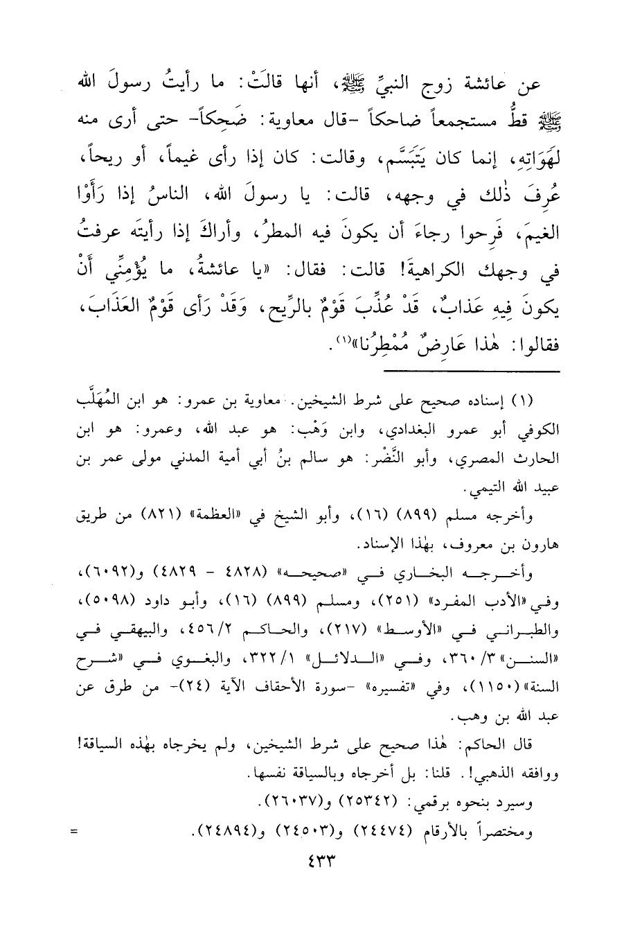 عَنْ عَائِشَةَ، زَوْجِ النَّبِيِّ صَلَّى اللهُ عَلَيْهِ وَسَلَّمَ أَنَّهَا قَالَتْ: مَا رَأَيْتُ رَسُولَ اللهِ صَلَّى اللهُ عَلَيْهِ وَسَلَّمَ قَطُّ مُسْتَجْمِعًا ضَاحِكًا، قَالَ مُعَاوِيَةُ: ضَحِكًا، حَتَّى أَرَى مِنْهُ لَهَوَاتِهِ، إِنَّمَا كَانَ يَتَبَسَّمُ وَقَالَتْ: كَانَ إِذَا رَأَى غَيْمًا، أَوْ رِيحًا، عُرِفَ ذَلِكَ فِي وَجْهِهِ، قَالَتْ: يَا رَسُولَ اللهِ، النَّاسُ إِذَا رَأَوْا الْغَيْمَ فَرِحُوا رَجَاءَ أَنْ يَكُونَ فِيهِ الْمَطَرُ، وَأَرَاكَ إِذَا رَأَيْتَهُ، عَرَفْتُ فِي وَجْهِكَ الْكَرَاهِيَةَ قَالَتْ: فَقَالَ: " يَا عَائِشَةُ، مَا يُؤْمِنِّي أَنْ يَكُونَ فِيهِ عَذَابٌ، قَدْ عُذِّبَ قَوْمٌ بِالرِّيحِ، وَقَدْ رَأَى قَوْمٌ الْعَذَابَ، فَقَالُوا: هَذَا عَارِضٌ مُمْطِرُنَا " (١)