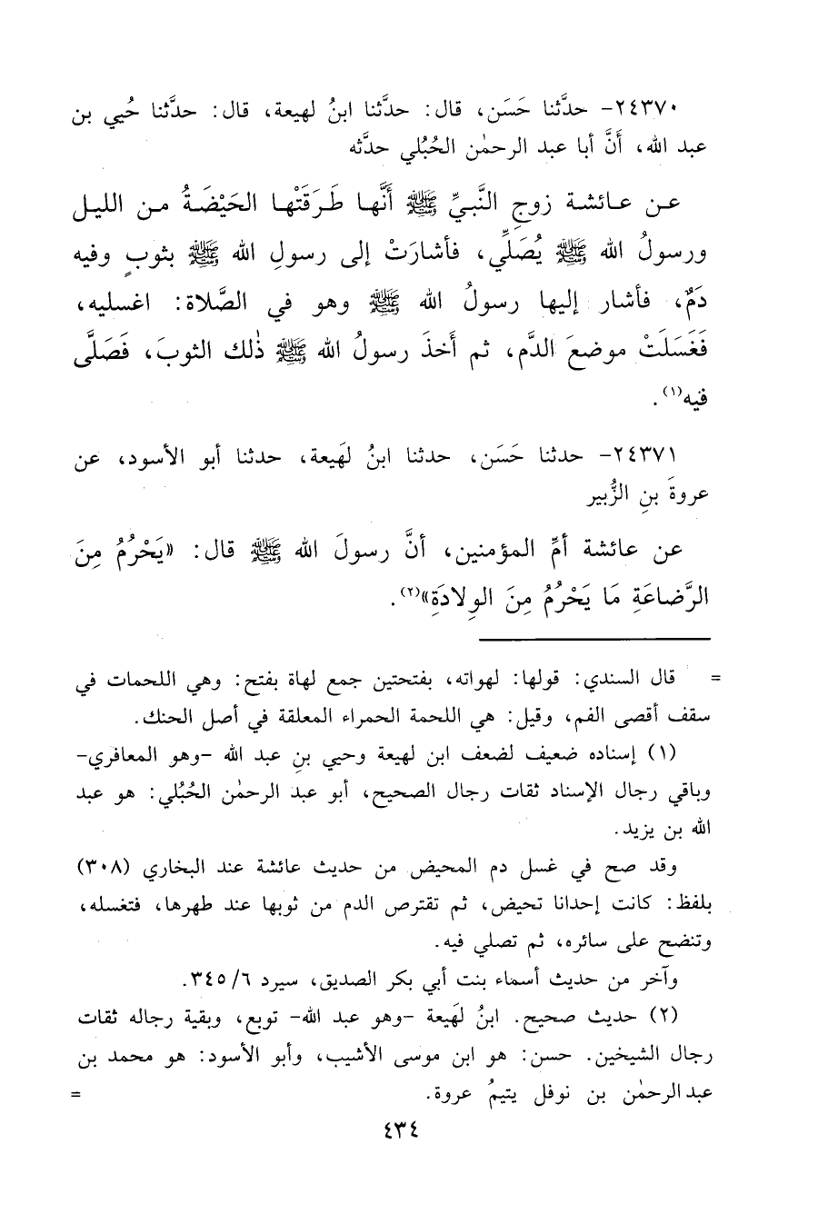٢٤٣٧٠ - حَدَّثَنَا حَسَنٌ قَالَ: حَدَّثَنَا ابْنُ لَهِيعَةَ قَالَ: حَدَّثَنَا حُيَيُّ بْنُ عَبْدِ اللهِ، أَنَّ أَبَا عَبْدِ الرَّحْمَنِ الْحُبُلِيَّ، حَدَّثَهُ، عَنْ عَائِشَةَ، زَوْجِ النَّبِيِّ صَلَّى اللهُ عَلَيْهِ وَسَلَّمَ " أَنَّهَا طَرَقَتْهَا الْحَيْضَةُ مِنَ اللَّيْلِ، وَرَسُولُ اللهِ صَلَّى اللهُ عَلَيْهِ وَسَلَّمَ يُصَلِّي، فَأَشَارَتْ إِلَى رَسُولِ اللهِ صَلَّى اللهُ عَلَيْهِ وَسَلَّمَ بِثَوْبٍ وَفِيهِ دَمٌ، فَأَشَارَ إِلَيْهَا رَسُولُ اللهِ صَلَّى اللهُ عَلَيْهِ وَسَلَّمَ وَهُوَ فِي الصَّلَاةِ، اغْسِلِيهِ، فَغَسَلَتْ مَوْضِعَ الدَّمِ، ثُمَّ أَخَذَ رَسُولُ اللهِ صَلَّى اللهُ عَلَيْهِ وَسَلَّمَ ذَلِكَ الثَّوْبَ، فَصَلَّى فِيهِ " (١)