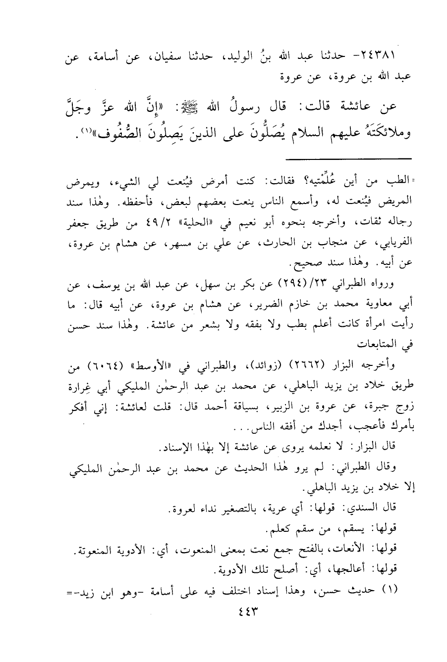 ٢٤٣٨١ - حَدَّثَنَا عَبْدُ اللهِ بْنُ الْوَلِيدِ، حَدَّثَنَا سُفْيَانُ، عَنْ أُسَامَةَ، عَنْ عَبْدِ اللهِ بْنِ عُرْوَةَ، عَنْ عُرْوَةَ، عَنْ عَائِشَةَ قَالَتْ: قَالَ رَسُولُ اللهِ صَلَّى اللهُ عَلَيْهِ وَسَلَّمَ: " إِنَّ اللهَ عَزَّ وَجَلَّ وَمَلَائِكَتَهُ عَلَيْهِمُ السَّلَامُ، يُصَلُّونَ عَلَى الَّذِينَ يَصِلُونَ الصُّفُوفَ " (١)