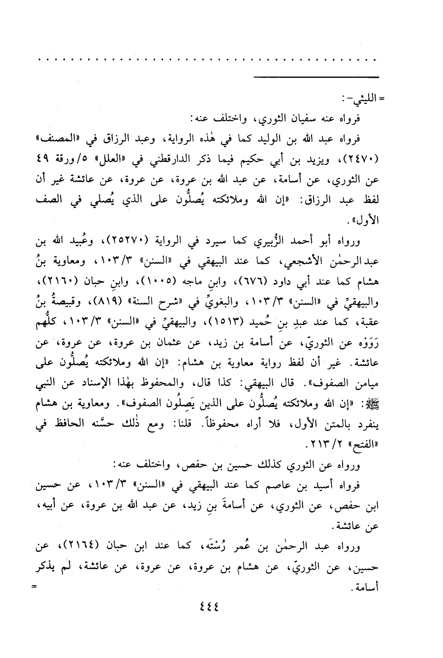 ورواه أبو أحمد الزُّبيري كما سيرد في الرواية (٢٥٢٧٠) ، وعُبيد الله بن عبد الرحمن الأشجعي، كما عند البيهقي في "السنن" ٣/١٠٣، ومعاوية بنُ هشام كما عند أبي داود (٦٧٦) ، وابنِ ماجه (١٠٠٥) ، وابنِ حبان (٢١٦٠) ، والبيهقيِّ في "السنن" ٣/١٠٣، والبغويِّ في "شرح السنة" (٨١٩) ، وقبيصةُ بنُ عقبة، كما عند عبدِ بنِ حُميد (١٥١٣) ، والبيهقيِّ في "السنن" ٣/١٠٣، كلُّهم رَوَوْه عن الثوري، عن أسامة بن زيد، عن عثمان بن عروة، عن عروة، عن عائشة. غير أن لفظ رواية معاوية بن هشام: "إن الله وملائكته يُصلُّون على ميامن الصفوف". قال البيهقي: كذا قال، والمحفوظ بهذا الإسناد عن النبي صَلَّى اللهُ عَلَيْهِ وَسَلَّمَ: "إن الله وملائكته يصلُّون على الذين يَصِلُون الصفوف". ومعاوية بن هشام ينفرد بالمتن الأول، فلا أراه محفوظاً. قلنا: ومع ذلك حسينه الحافظ في "الفتح" ٢/٢١٣.