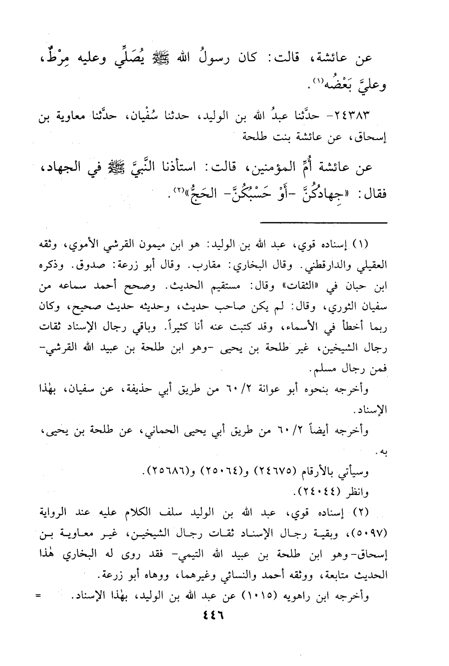 ٢٤٣٨٣ - حَدَّثَنَا عَبْدُ اللهِ بْنُ الْوَلِيدِ، حَدَّثَنَا سُفْيَانُ، حَدَّثَنَا مُعَاوِيَةُ بْنُ إِسْحَاقَ، عَنْ عَائِشَةَ بِنْتِ طَلْحَةَ، عَنْ عَائِشَةَ أُمِّ الْمُؤْمِنِينَ قَالَتْ: اسْتَأْذَنَّا النَّبِيَّ صَلَّى اللهُ عَلَيْهِ وَسَلَّمَ فِي الْجِهَادِ، فَقَالَ: " جِهَادُكُنَّ، أَوْ حَسْبُكُنَّ الْحَجُّ " (٢)