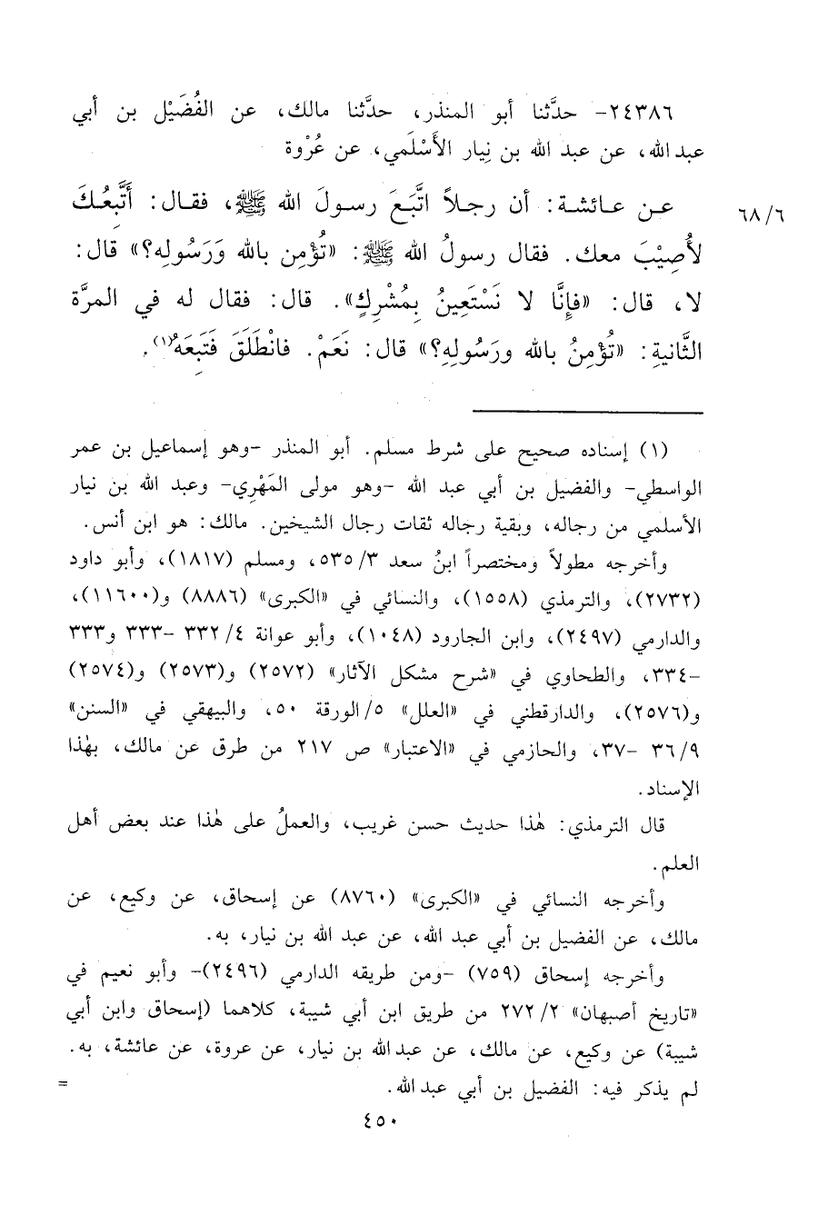 ٢٤٣٨٦ - حَدَّثَنَا أَبُو الْمُنْذِرِ، حَدَّثَنَا مَالِكٌ، عَنِ الْفُضَيْلِ بْنِ أَبِي عَبْدِ اللهِ، عَنْ عَبْدِ اللهِ بْنِ نِيَارٍ الْأَسْلَمِيِّ، عَنْ عُرْوَةَ، عَنْ عَائِشَةَ، أَنَّ رَجُلًا اتَّبَعَ رَسُولَ اللهِ صَلَّى اللهُ عَلَيْهِ وَسَلَّمَ فَقَالَ: أَتَّبِعُكَ لِأُصِيبَ مَعَكَ، فَقَالَ رَسُولُ اللهِ صَلَّى اللهُ عَلَيْهِ وَسَلَّمَ: " تُؤْمِنُ بِاللهِ وَرَسُولِهِ؟ " قَالَ: لَا، قَالَ: " فَإِنَّا لَا نَسْتَعِينُ بِمُشْرِكٍ " قَالَ: فَقَالَ لَهُ فِي الْمَرَّةِ الثَّانِيَةِ: " تُؤْمِنُ بِاللهِ وَرَسُولِهِ؟ " قَالَ: " نَعَمْ، فَانْطَلَقَ فَتَبِعَهُ (١)