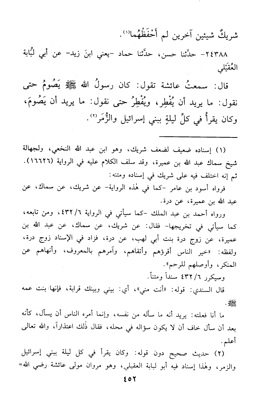 ٢٤٣٨٨ - حَدَّثَنَا حَسَنٌ، حَدَّثَنَا حَمَّادٌ يَعْنِي ابْنَ زَيْدٍ، عَنْ أَبِي لُبَابَةَ الْعُقَيْلِيِّ قَالَ: سَمِعْتُ عَائِشَةَ تَقُولُ: " كَانَ رَسُولُ اللهِ صَلَّى اللهُ عَلَيْهِ وَسَلَّمَ يَصُومُ حَتَّى نَقُولَ: مَا يُرِيدُ أَنْ يُفْطِرَ، وَيُفْطِرُ حَتَّى نَقُولَ: مَا يُرِيدُ أَنْ يَصُومَ، وَكَانَ يَقْرَأُ فِي كُلِّ لَيْلَةٍ بِبَنِي إِسْرَائِيلَ، وَالزُّمَرِ " (٢)