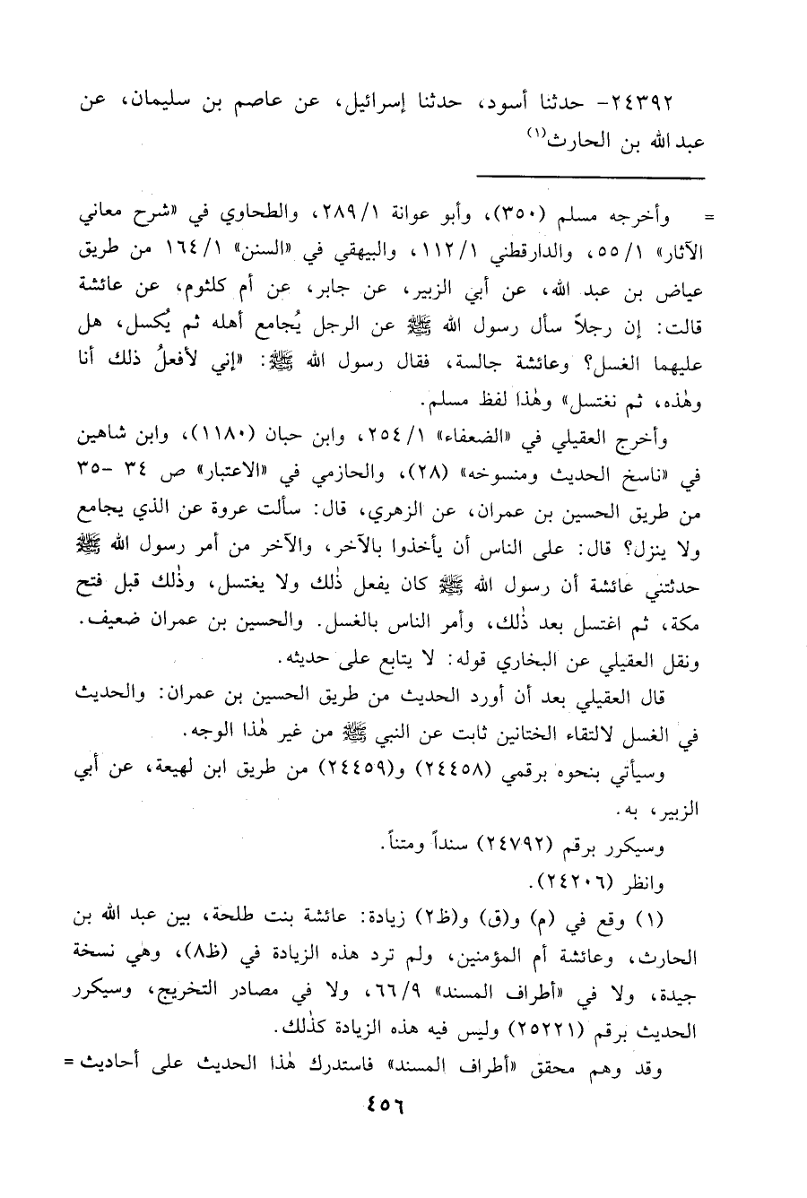 ٢٤٣٩٢ - حَدَّثَنَا أَسْوَدُ، حَدَّثَنَا إِسْرَائِيلُ، عَنْ عَاصِمِ بْنِ سُلَيْمَانَ، عَنْ عَبْدِ اللهِ بْنِ الْحَارِثِ، (١)