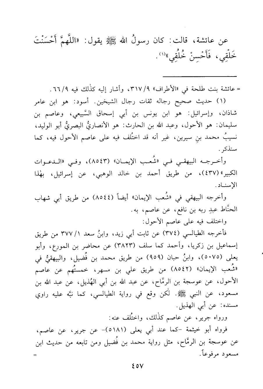 عَنْ عَائِشَةَ قَالَتْ: كَانَ رَسُولُ اللهِ صَلَّى اللهُ عَلَيْهِ وَسَلَّمَ يَقُولُ: " اللهُمَّ أَحْسَنْتَ خَلْقِي، فَأَحْسِنْ خُلُقِي " (١)