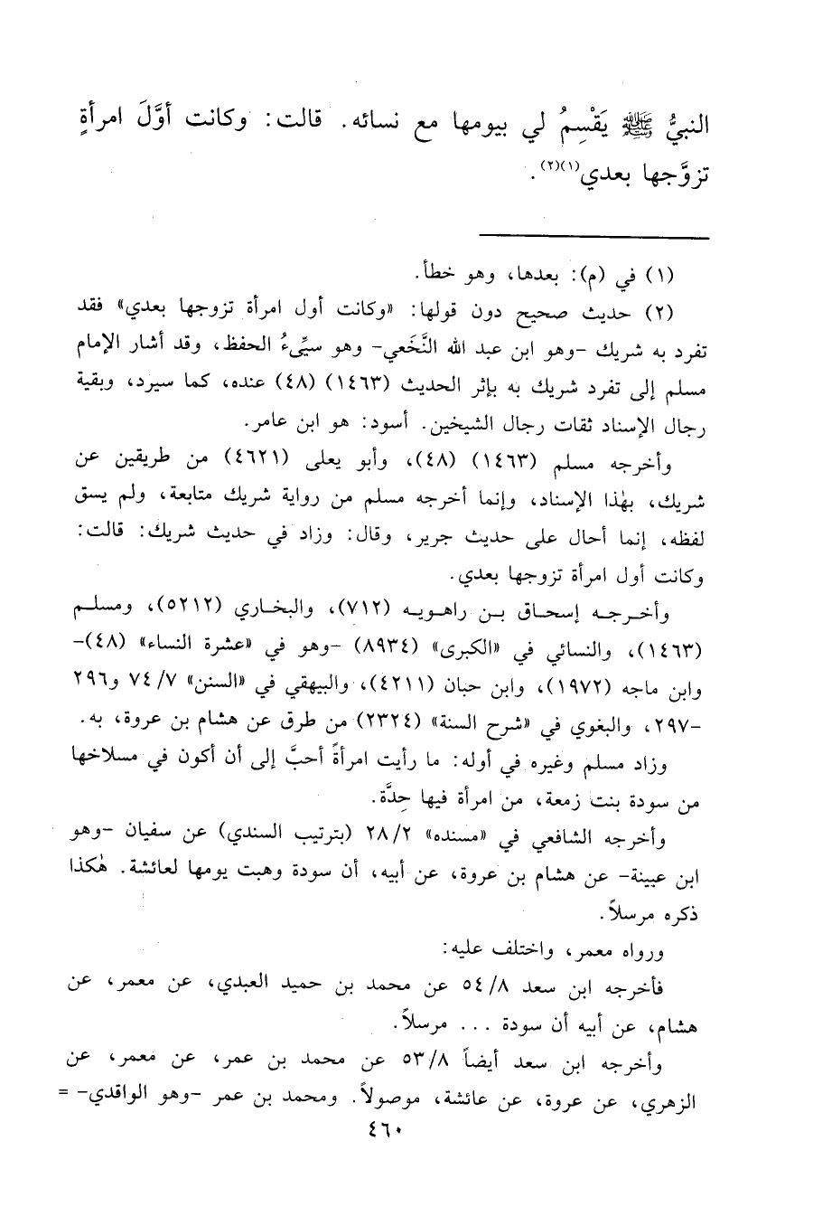 النَّبِيُّ صَلَّى اللهُ عَلَيْهِ وَسَلَّمَ يَقْسِمُ لِي بِيَوْمِهَا مَعَ نِسَائِهِ " قَالَتْ: " وَكَانَتْ أَوَّلَ امْرَأَةٍ تَزَوَّجَهَا بَعْدِي (١) " (٢)