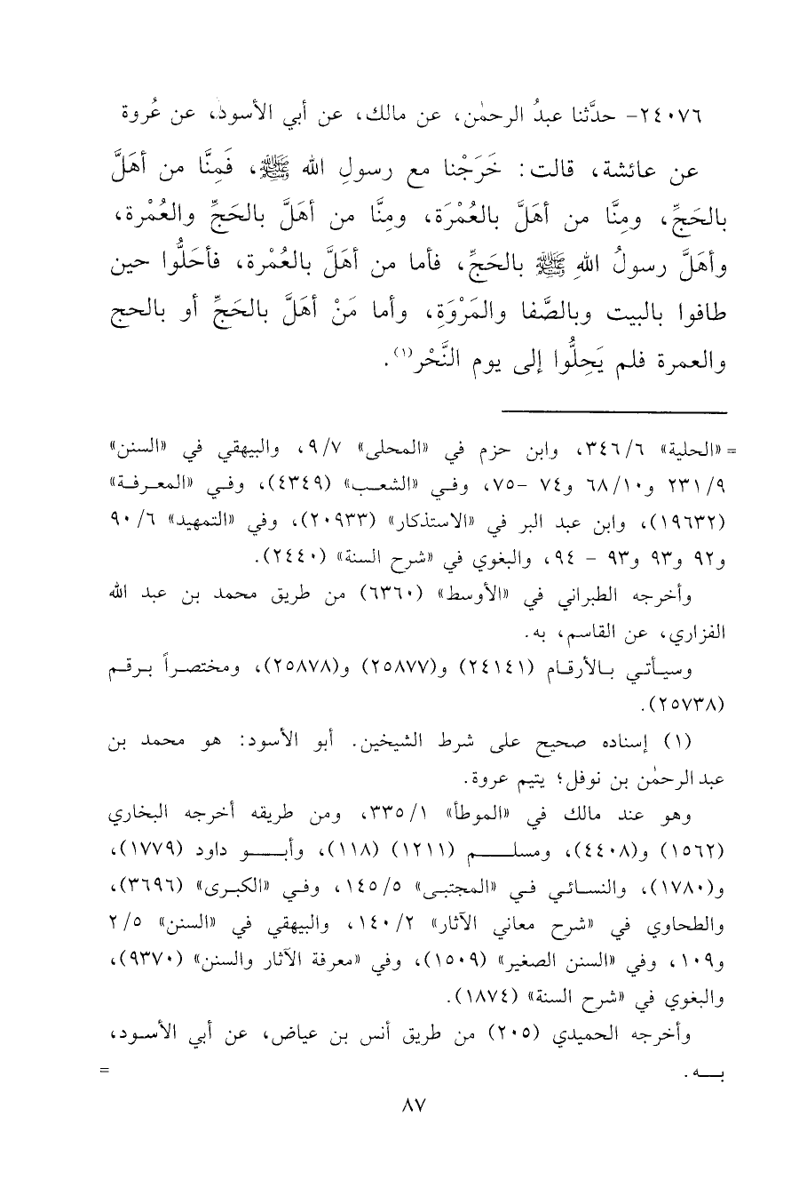 ٢٤٠٧٦ - حَدَّثَنَا عَبْدُ الرَّحْمَنِ، عَنْ مَالِكٍ، عَنْ أَبِي الْأَسْوَدِ، عَنْ عُرْوَةَ، عَنْ عَائِشَةَ قَالَتْ: خَرَجْنَا مَعَ رَسُولِ اللهِ صَلَّى اللهُ عَلَيْهِ وَسَلَّمَ، فَمِنَّا مَنْ أَهَلَّ بِالْحَجِّ، وَمِنَّا مَنْ أَهَلَّ بِالْعُمْرَةِ، وَمِنَّا مَنْ أَهَلَّ بِالْحَجِّ وَالْعُمْرَةِ، " وَأَهَلَّ رَسُولُ اللهِ صَلَّى اللهُ عَلَيْهِ وَسَلَّمَ بِالْحَجِّ "، فَأَمَّا مَنْ أَهَلَّ بِالْعُمْرَةِ، فَأَحَلُّوا حِينَ طَافُوا بِالْبَيْتِ، وَبِالصَّفَا وَالْمَرْوَةِ، وَأَمَّا مَنْ أَهَلَّ بِالْحَجِّ أَوْ بِالْحَجِّ وَالْعُمْرَةِ، فَلَمْ يُحِلُّوا إِلَى يَوْمِ النَّحْرِ (١)