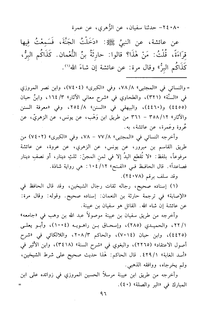 ٢٤٠٨٠ - حَدَّثَنَا سُفْيَانُ، عَنِ الزُّهْرِيِّ، عَنْ عَمْرَةَ، عَنْ عَائِشَةَ، عَنِ النَّبِيِّ صَلَّى اللهُ عَلَيْهِ وَسَلَّمَ، " دَخَلْتُ الْجَنَّةَ فَسَمِعْتُ فِيهَا قِرَاءَةً، قُلْتُ: مَنْ هَذَا؟ قَالُوا: حَارِثَةُ بْنُ النُّعْمَانِ كَذَاكُمُ الْبِرُّ، كَذَاكُمُ الْبِرُّ "، وَقَالَ مَرَّةً عَنْ عَائِشَةَ: إِنْ شَاءَ اللهُ (١)