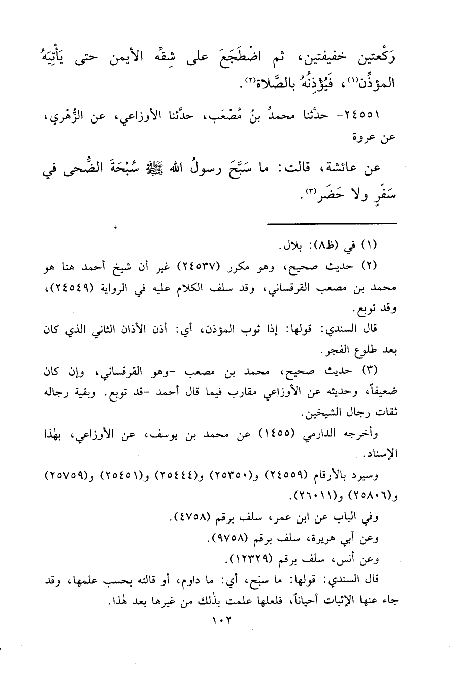 ٢٤٥٥١ - حَدَّثَنَا مُحَمَّدُ بْنُ مُصْعَبٍ، حَدَّثَنَا الْأَوْزَاعِيُّ، عَنْ الزُّهْرِيِّ، عَنْ عُرْوَةَ، عَنْ عَائِشَةَ، قَالَتْ: " مَا سَبَّحَ رَسُولُ اللهِ صَلَّى اللهُ عَلَيْهِ وَسَلَّمَ سُبْحَةَ الضُّحَى، فِي سَفَرٍ، وَلَا حَضَرٍ " (٣)