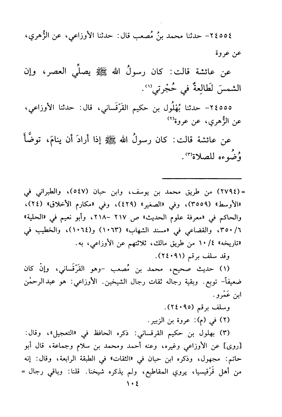 ٢٤٥٥٥ - حَدَّثَنَا بُهْلُولُ بْنُ حَكِيمٍ الْقَرْقَسَانِيُّ، قَالَ: حَدَّثَنَا الْأَوْزَاعِيُّ، عَنْ الزُّهْرِيِّ، عَنْ عُرْوَةَ (٢) ، عَنْ عَائِشَةَ، قَالَتْ: " كَانَ رَسُولُ اللهِ صَلَّى اللهُ عَلَيْهِ وَسَلَّمَ إِذَا أَرَادَ أَنْ يَنَامَ، تَوَضَّأَ وُضُوءَهُ لِلصَّلَاةِ " (٣)