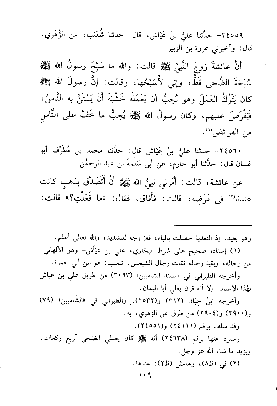 ٢٤٥٥٩ - حَدَّثَنَا عَلِيُّ بْنُ عَيَّاشٍ، قَالَ: حَدَّثَنَا شُعَيْبٌ، عَنْ الزُّهْرِيِّ، قَالَ: وَأَخْبَرَنِي عُرْوَةُ بْنُ الزُّبَيْرِ، أَنَّ عَائِشَةَ، زَوْجَ النَّبِيِّ صَلَّى اللهُ عَلَيْهِ وَسَلَّمَ، قَالَتْ: " وَاللهِ، مَا سَبَّحَ رَسُولُ اللهِ صَلَّى اللهُ عَلَيْهِ وَسَلَّمَ، سُبْحَةَ الضُّحَى قَطُّ، وَإِنِّي لَأُسَبِّحُهَا "، وَقَالَتْ: " إِنَّ رَسُولَ اللهِ صَلَّى اللهُ عَلَيْهِ وَسَلَّمَ، كَانَ يَتْرُكُ الْعَمَلَ وَهُوَ يُحِبُّ أَنْ يَعْمَلَهُ، خَشْيَةَ أَنْ يَسْتَنَّ بِهِ النَّاسُ، فَيُفْرَضُ عَلَيْهِمْ، وَكَانَ رَسُولُ اللهِ صَلَّى اللهُ عَلَيْهِ وَسَلَّمَ، يُحِبُّ مَا خَفَّ عَلَى النَّاسِ مِنَ الْفَرَائِضِ " (١)