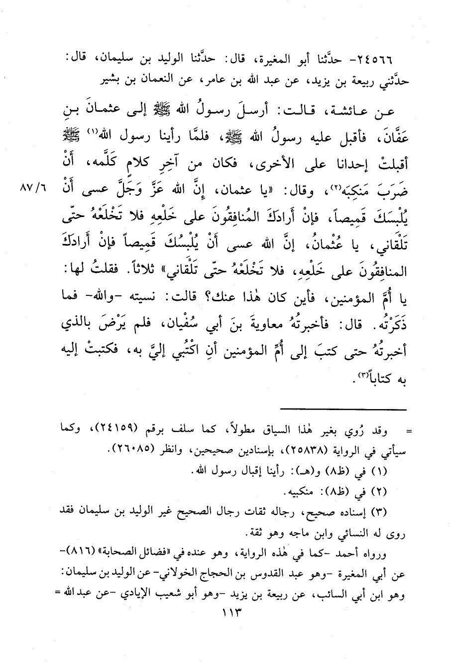 ٢٤٥٦٦ - حَدَّثَنَا أَبُو الْمُغِيرَةِ، قَالَ: حَدَّثَنَا الْوَلِيدُ بْنُ سُلَيْمَانَ، قَالَ: حَدَّثَنِي رَبِيعَةُ بْنُ يَزِيدَ، عَنْ عَبْدِ اللهِ بْنِ عَامِرٍ، عَنْ النُّعْمَانِ بْنِ بَشِيرٍ، عَنْ عَائِشَةَ، قَالَتْ: أَرْسَلَ رَسُولُ اللهِ صَلَّى اللهُ عَلَيْهِ وَسَلَّمَ إِلَى عُثْمَانَ بْنِ عَفَّانَ، فَأَقْبَلَ عَلَيْهِ رَسُولُ اللهِ صَلَّى اللهُ عَلَيْهِ وَسَلَّمَ، فَلَمَّا رَأَيْنَا رَسُولَ اللهِ (١) صَلَّى اللهُ عَلَيْهِ وَسَلَّمَ، أَقْبَلَتْ إِحْدَانَا عَلَى الْأُخْرَى، فَكَانَ مِنْ آخِرِ كَلَامٍ كَلَّمَهُ، أَنْ ضَرَبَ مَنْكِبَهُ (٢) ، وَقَالَ: " يَا عُثْمَانُ، إِنَّ اللهَ عَزَّ وَجَلَّ عَسَى أَنْ يُلْبِسَكَ قَمِيصًا، فَإِنْ أَرَادَكَ الْمُنَافِقُونَ عَلَى خَلْعِهِ، فَلَا تَخْلَعْهُ حَتَّى تَلْقَانِي، يَا عُثْمَانُ، إِنَّ اللهَ عَسَى أَنْ يُلْبِسَكَ قَمِيصًا، فَإِنْ أَرَادَكَ الْمُنَافِقُونَ عَلَى خَلْعِهِ، فَلَا تَخْلَعْهُ حَتَّى تَلْقَانِي " ثَلَاثًا، فَقُلْتُ لَهَا: يَا أُمَّ الْمُؤْمِنِينَ، فَأَيْنَ كَانَ هَذَا عَنْكِ؟ قَالَتْ: نَسِيتُهُ، وَاللهِ فَمَا ذَكَرْتُهُ. قَالَ: فَأَخْبَرْتُهُ مُعَاوِيَةَ بْنَ أَبِي سُفْيَانَ، فَلَمْ يَرْضَ بِالَّذِي أَخْبَرْتُهُ حَتَّى كَتَبَ إِلَى أُمِّ الْمُؤْمِنِينَ أَنْ اكْتُبِي إِلَيَّ بِهِ، فَكَتَبَتْ إِلَيْهِ بِهِ كِتَابًا (٣)
