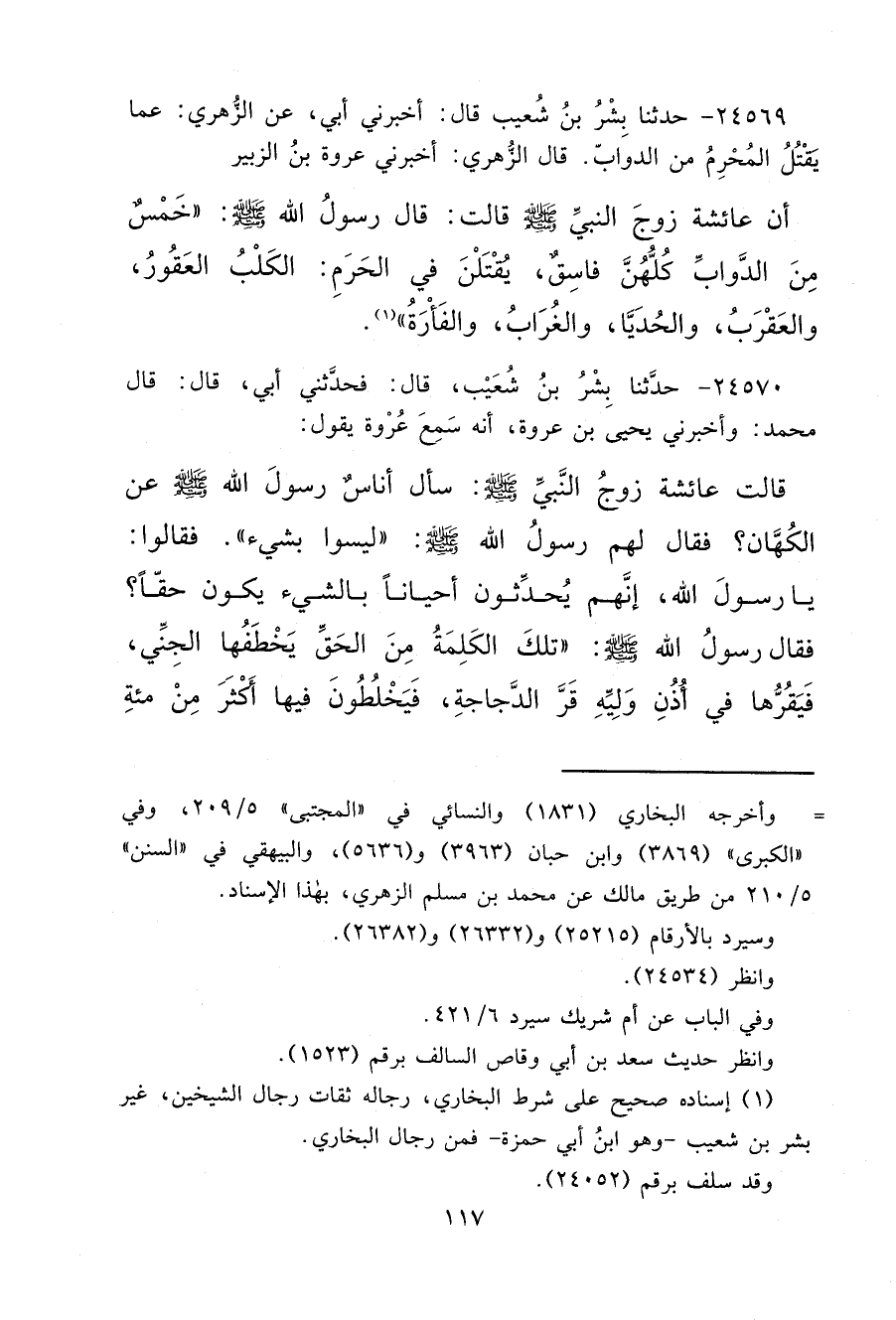 ٢٤٥٦٩ - حَدَّثَنَا بِشْرُ بْنُ شُعَيْبٍ، قَالَ: أَخْبَرَنِي أَبِي، عَنْ الزُّهْرِيِّ، عَمَّا يَقْتُلُ الْمُحْرِمُ مِنَ الدَّوَابِّ، قَالَ الزُّهْرِيُّ: أَخْبَرَنِي عُرْوَةُ بْنُ الزُّبَيْرِ، أَنَّ عَائِشَةَ، زَوْجَ النَّبِيِّ صَلَّى اللهُ عَلَيْهِ وَسَلَّمَ، قَالَتْ: قَالَ رَسُولُ اللهِ صَلَّى اللهُ عَلَيْهِ وَسَلَّمَ: " خَمْسٌ مِنَ الدَّوَابِّ كُلُّهُنَّ فَاسِقٌ، يُقْتَلْنَ فِي الْحَرَمِ: الْكَلْبُ الْعَقُورُ، وَالْعَقْرَبُ، وَالْحُدَيَّا، وَالْغُرَابُ، وَالْفَأْرَةُ " (١)