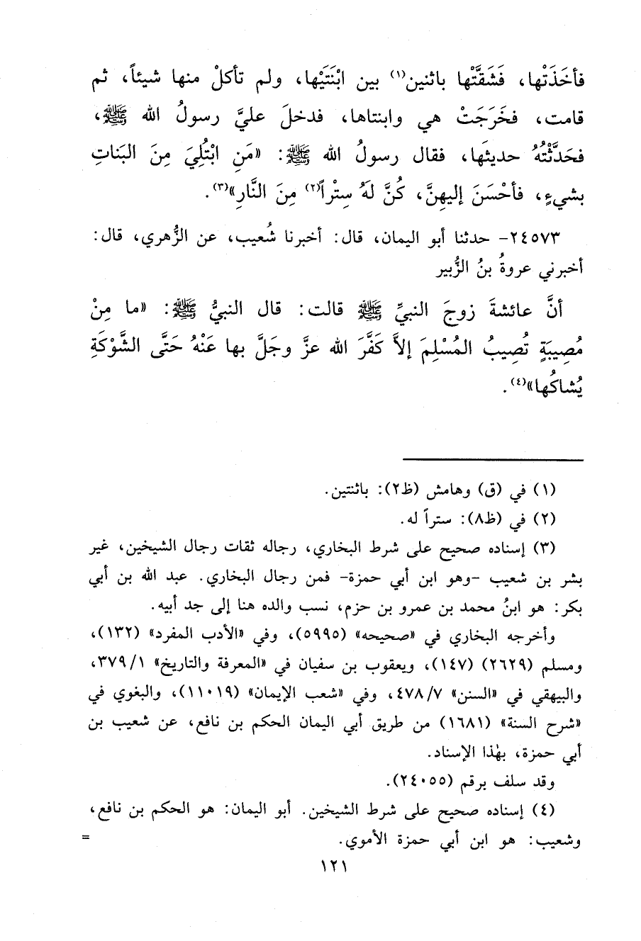 ٢٤٥٧٣ - حَدَّثَنَا أَبُو الْيَمَانِ، قَالَ: أَخْبَرَنَا شُعَيْبٌ، عَنْ الزُّهْرِيِّ، قَالَ: أَخْبَرَنِي عُرْوَةُ بْنُ الزُّبَيْرِ، أَنَّ عَائِشَةَ، زَوْجَ النَّبِيِّ صَلَّى اللهُ عَلَيْهِ وَسَلَّمَ، قَالَتْ: قَالَ النَّبِيُّ صَلَّى اللهُ عَلَيْهِ وَسَلَّمَ: " مَا مِنْ مُصِيبَةٍ تُصِيبُ الْمُسْلِمَ، إِلَّا كَفَّرَ اللهُ عَزَّ وَجَلَّ بِهَا عَنْهُ، حَتَّى الشَّوْكَةُ يُشَاكُهَا " (٤)