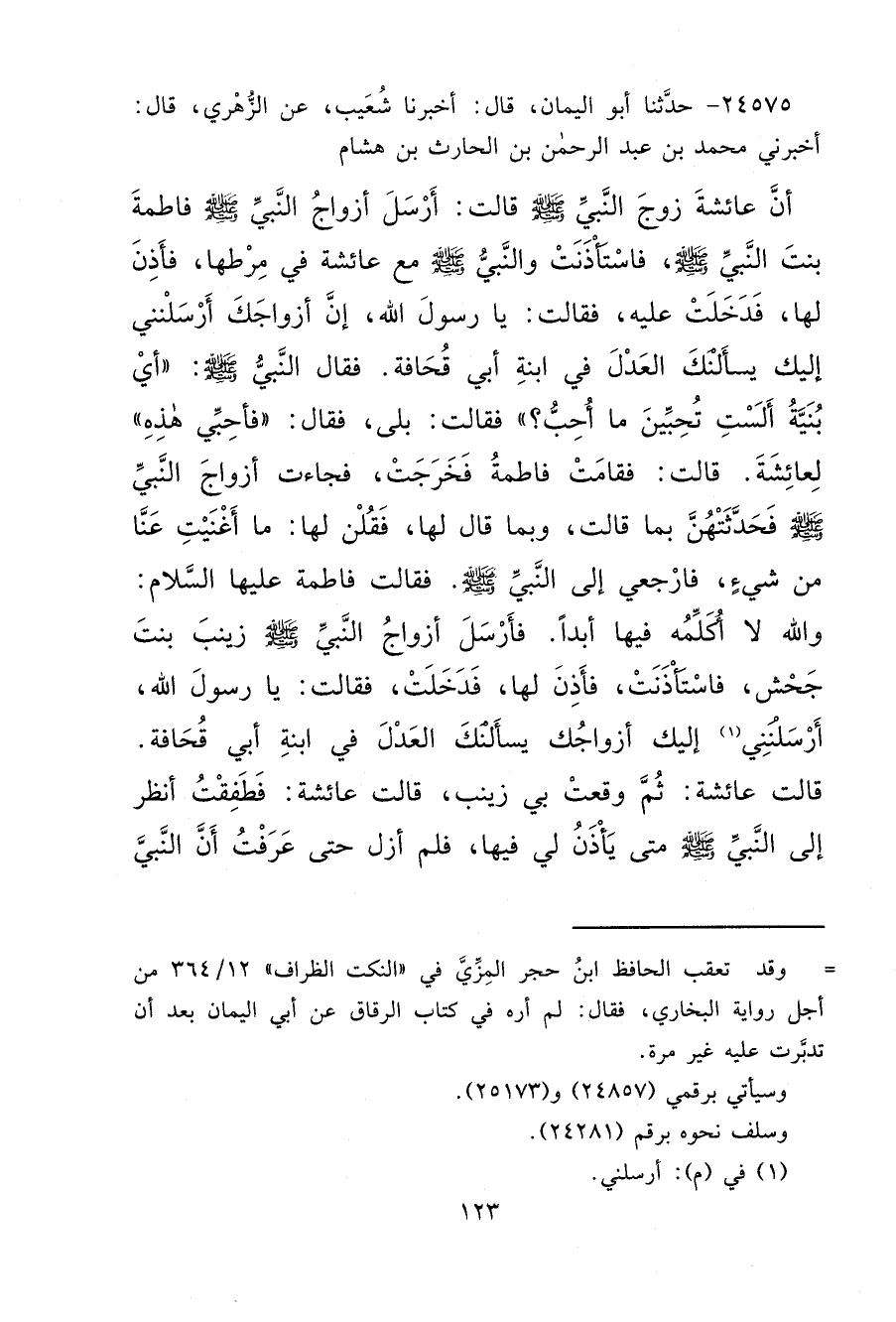 ٢٤٥٧٥ - حَدَّثَنَا أَبُو الْيَمَانِ، قَالَ: أَخْبَرَنَا شُعَيْبٌ، عَنْ الزُّهْرِيِّ، قَالَ: أَخْبَرَنِي مُحَمَّدُ بْنُ عَبْدِ الرَّحْمَنِ بْنِ الْحَارِثِ بْنِ هِشَامٍ، أَنَّ عَائِشَةَ، زَوْجَ النَّبِيِّ صَلَّى اللهُ عَلَيْهِ وَسَلَّمَ، قَالَتْ: أَرْسَلَ أَزْوَاجُ النَّبِيِّ صَلَّى اللهُ عَلَيْهِ وَسَلَّمَ فَاطِمَةَ بِنْتَ النَّبِيِّ صَلَّى اللهُ عَلَيْهِ وَسَلَّمَ، فَاسْتَأْذَنَتْ، وَالنَّبِيُّ صَلَّى اللهُ عَلَيْهِ وَسَلَّمَ مَعَ عَائِشَةَ فِي مِرْطِهَا، فَأَذِنَ لَهَا، فَدَخَلَتْ عَلَيْهِ، فَقَالَتْ: يَا رَسُولَ اللهِ، إِنَّ أَزْوَاجَكَ أَرْسَلْنَنِي إِلَيْكَ يَسْأَلْنَكَ الْعَدْلَ فِي ابْنَةِ أَبِي قُحَافَةَ، فَقَالَ النَّبِيُّ صَلَّى اللهُ عَلَيْهِ وَسَلَّمَ: " أَيْ بُنَيَّةُ، أَلَسْتِ تُحِبِّينَ مَا أُحِبُّ؟ " فَقَالَتْ: بَلَى، فَقَالَ: " فَأَحِبِّي هَذِهِ " لِعَائِشَةَ، قَالَتْ: فَقَامَتْ فَاطِمَةُ، فَخَرَجَتْ، فَجَاءَتْ أَزْوَاجَ النَّبِيِّ صَلَّى اللهُ عَلَيْهِ وَسَلَّمَ، فَحَدَّثَتْهُنَّ بِمَا قَالَتْ، وَبِمَا قَالَ لَهَا، فَقُلْنَ لَهَا: مَا أَغْنَيْتِ عَنَّا مِنْ شَيْءٍ، فَارْجِعِي إِلَى النَّبِيِّ صَلَّى اللهُ عَلَيْهِ وَسَلَّمَ، فَقَالَتْ فَاطِمَةُ عَلَيْهَا السَّلَام: وَاللهِ لَا أُكَلِّمُهُ فِيهَا أَبَدًا، فَأَرْسَلَ أَزْوَاجُ النَّبِيِّ صَلَّى اللهُ عَلَيْهِ وَسَلَّمَ زَيْنَبَ بِنْتَ جَحْشٍ، فَاسْتَأْذَنَتْ، فَأَذِنَ لَهَا، فَدَخَلَتْ، فَقَالَتْ: يَا رَسُولَ اللهِ، أَرْسَلَنَنِي (١) إِلَيْكَ أَزْوَاجُكَ يَسْأَلْنَكَ الْعَدْلَ فِي ابْنَةِ أَبِي قُحَافَةَ، قَالَتْ عَائِشَةُ: ثُمَّ وَقَعَتْ بِي زَيْنَبُ، قَالَتْ عَائِشَةُ: فَطَفِقْتُ أَنْظُرُ إِلَى النَّبِيِّ صَلَّى اللهُ عَلَيْهِ وَسَلَّمَ، مَتَى يَأْذَنُ لِي فِيهَا، فَلَمْ أَزَلْ حَتَّى عَرَفْتُ أَنَّ النَّبِيَّ صَلَّى اللهُ عَلَيْهِ وَسَلَّمَ