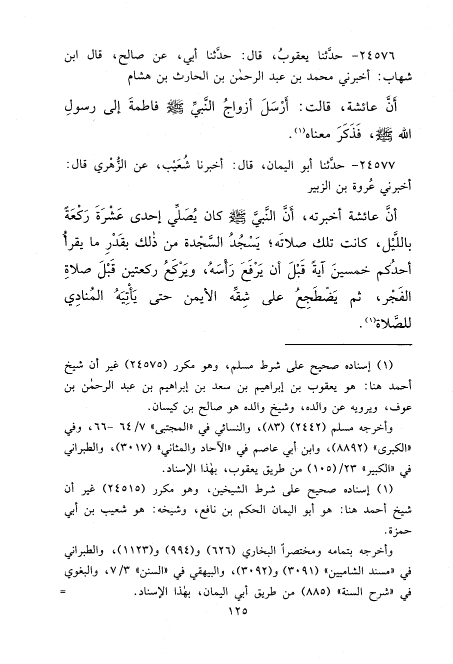 ٢٤٥٧٦ - حَدَّثَنَا يَعْقُوبُ، قَالَ: حَدَّثَنَا أَبِي، عَنْ صَالِحٍ، قَالَ ابْنُ شِهَابٍ: أَخْبَرَنِي مُحَمَّدُ بْنُ عَبْدِ الرَّحْمَنِ بْنِ الْحَارِثِ بْنِ هِشَامٍ، أَنَّ عَائِشَةَ، قَالَتْ: أَرْسَلَ أَزْوَاجُ النَّبِيِّ صَلَّى اللهُ عَلَيْهِ وَسَلَّمَ فَاطِمَةَ إِلَى رَسُولِ اللهِ صَلَّى اللهُ عَلَيْهِ وَسَلَّمَ، فَذَكَرَ مَعْنَاهُ (١)
