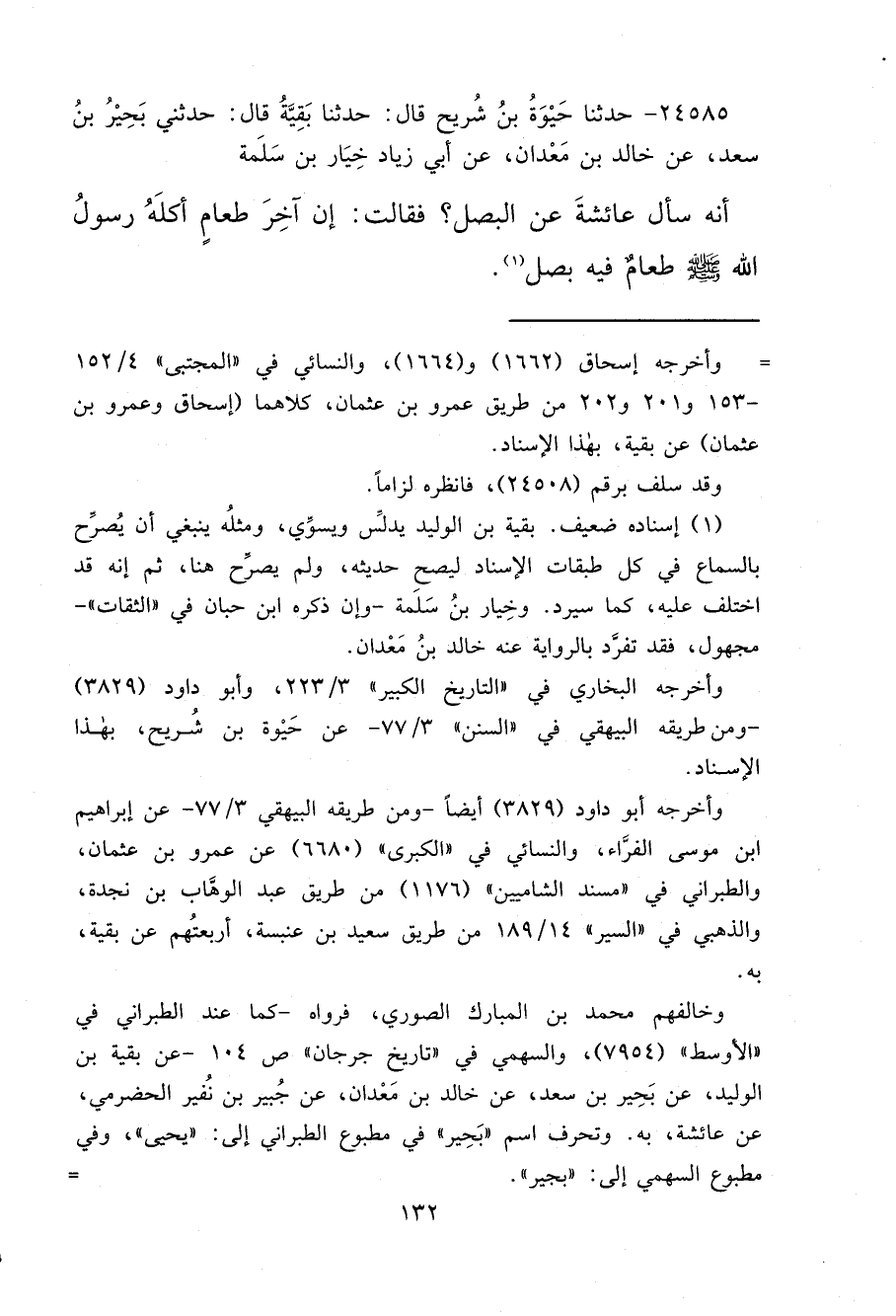 ٢٤٥٨٥ - حَدَّثَنَا حَيْوَةُ بْنُ شُرَيْحٍ، قَالَ: حَدَّثَنَا بَقِيَّةُ، قَالَ: حَدَّثَنِي بَحِيرُ بْنُ سَعْدٍ، عَنْ خَالِدِ بْنِ مَعْدَانَ، عَنْ أَبِي زِيَادٍ خِيَارِ بْنِ سَلَمَةَ، أَنَّهُ سَأَلَ عَائِشَةَ عَنِ الْبَصَلِ، فَقَالَتْ: " إِنَّ آخِرَ طَعَامٍ أَكَلَهُ رَسُولُ اللهِ صَلَّى اللهُ عَلَيْهِ وَسَلَّمَ، طَعَامٌ فِيهِ بَصَلٌ " (١)