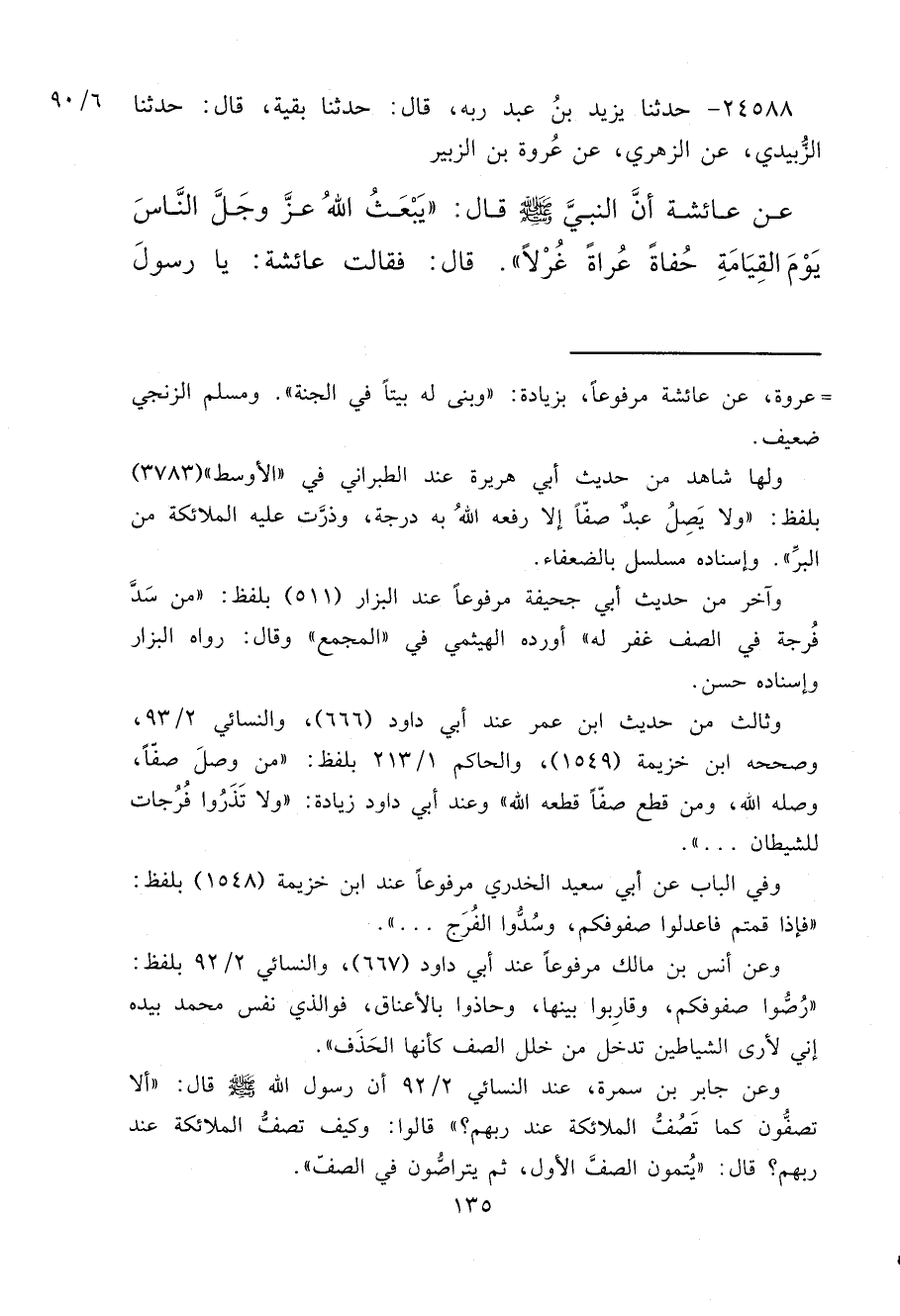 ٢٤٥٨٨ - حَدَّثَنَا يَزِيدُ بْنُ عَبْدِ رَبِّهِ، قَالَ: حَدَّثَنَا بَقِيَّةُ، قَالَ: حَدَّثَنَا الزُّبَيْدِيُّ، عَنْ الزُّهْرِيِّ، عَنْ عُرْوَةَ بْنِ الزُّبَيْرِ، عَنْ عَائِشَةَ، أَنَّ النَّبِيَّ صَلَّى اللهُ عَلَيْهِ وَسَلَّمَ، قَالَ: " يَبْعَثُ اللهُ عَزَّ وَجَلَّ النَّاسَ يَوْمَ الْقِيَامَةِ حُفَاةً عُرَاةً غُرْلًا "، قَالَ: فَقَالَتْ عَائِشَةُ: يَا رَسُولَ