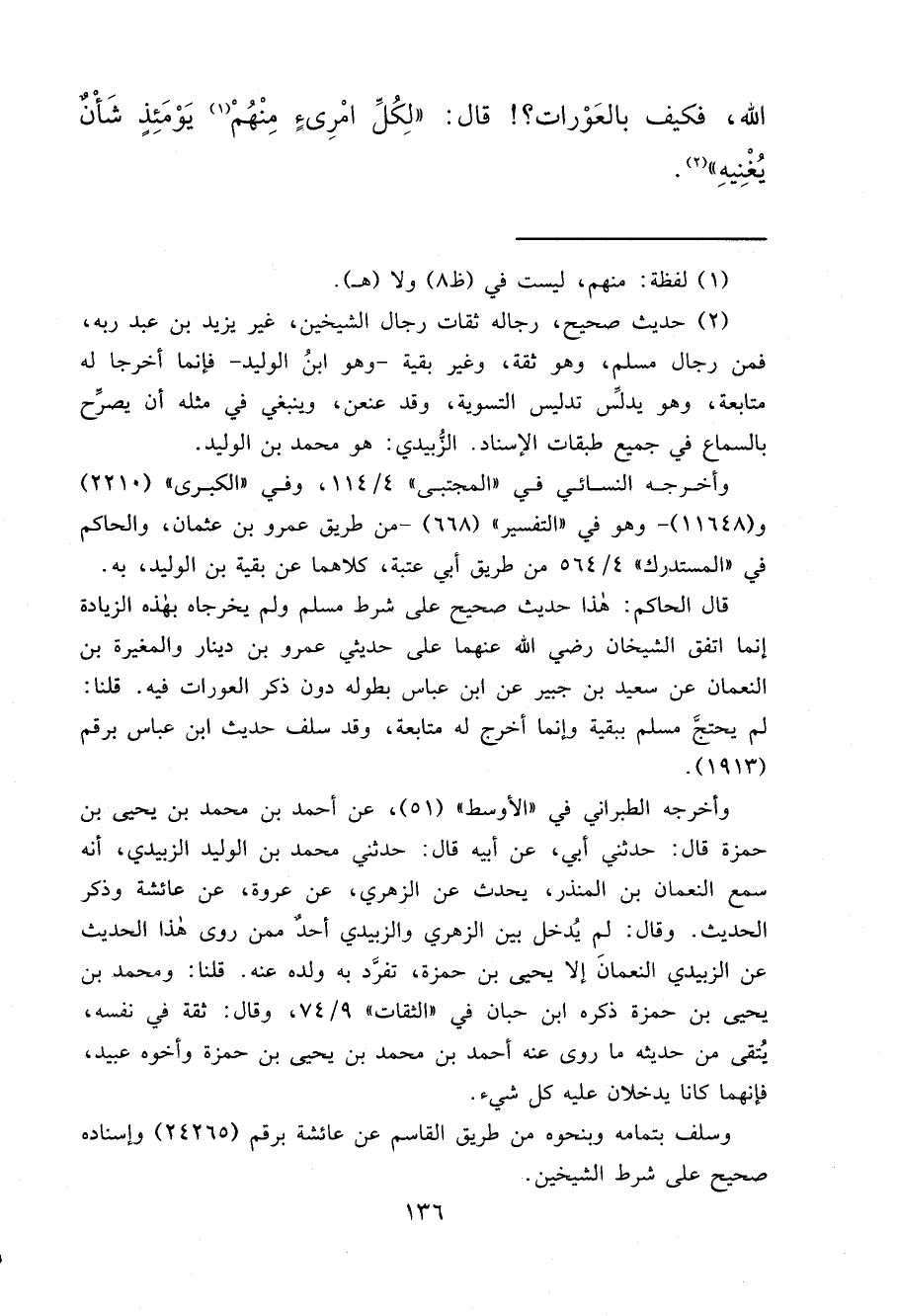 قال الحاكم: هذا حديث صحيح على شرط مسلم ولم يخرجاه بهذه الزيادة إنما اتفق الشيخان رضي الله عنهما على حديثي عمرو بن دينار والمغيرة بن النعمان عن سعيد بن جبير عن ابن عباس بطوله دون ذكر العورات فيه. قلنا: لم يحتجَّ مسلم ببقية وإنما أخرج له متابعة، وقد سلف حديث ابن عباس برقم (١٩١٣) .